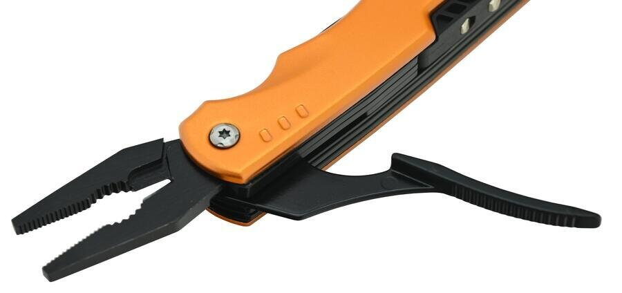 Multifunkční nůž se sekerou Cattara MULTI AXE 15v1 využijete při stanování, na túrách, při rybaření, na výletech do přírody i doma na zahradě. Najdete na něm hned 15 nástrojů. Hlavním nástrojem je sekyra se zakrytým ostřím, kladívko a čelní část s výklopným držákem bitů (plochý, křížový Ph a Pz). Vnitřní strana sekyry je zdrsněná. Ve spodní části můžete tahem vyklopit kombinované kleště (štípací a ozubené čelisti), nůž se 7,5cm čepelí a multifunkční čepel s otvírákem konzerv, otvírákem lahví, pilkou, plochým šroubovákem, malým bočním ostřím a klíčem na matice.