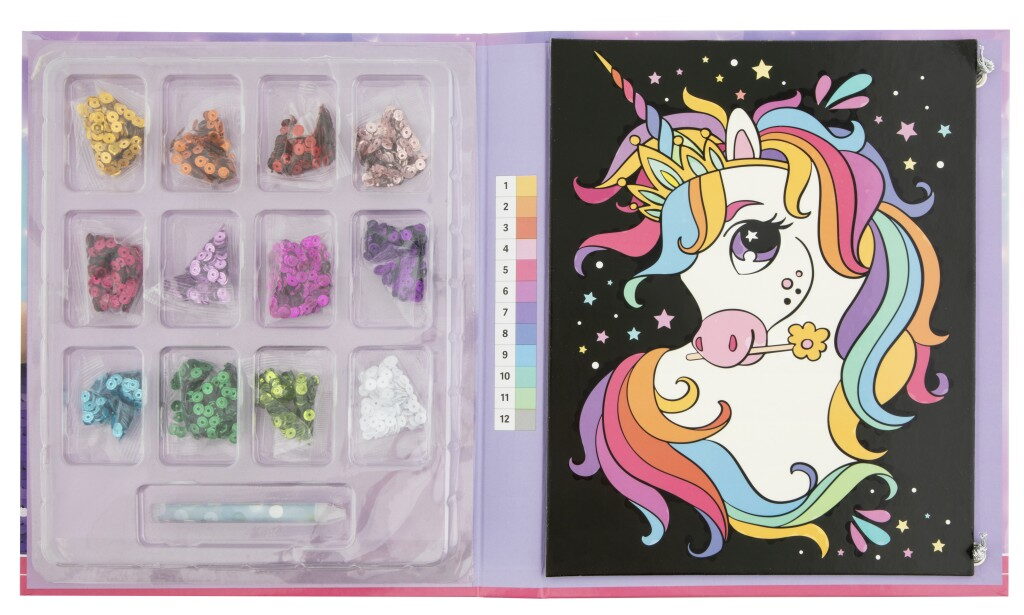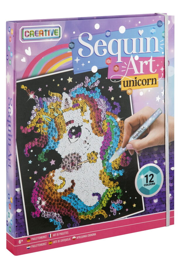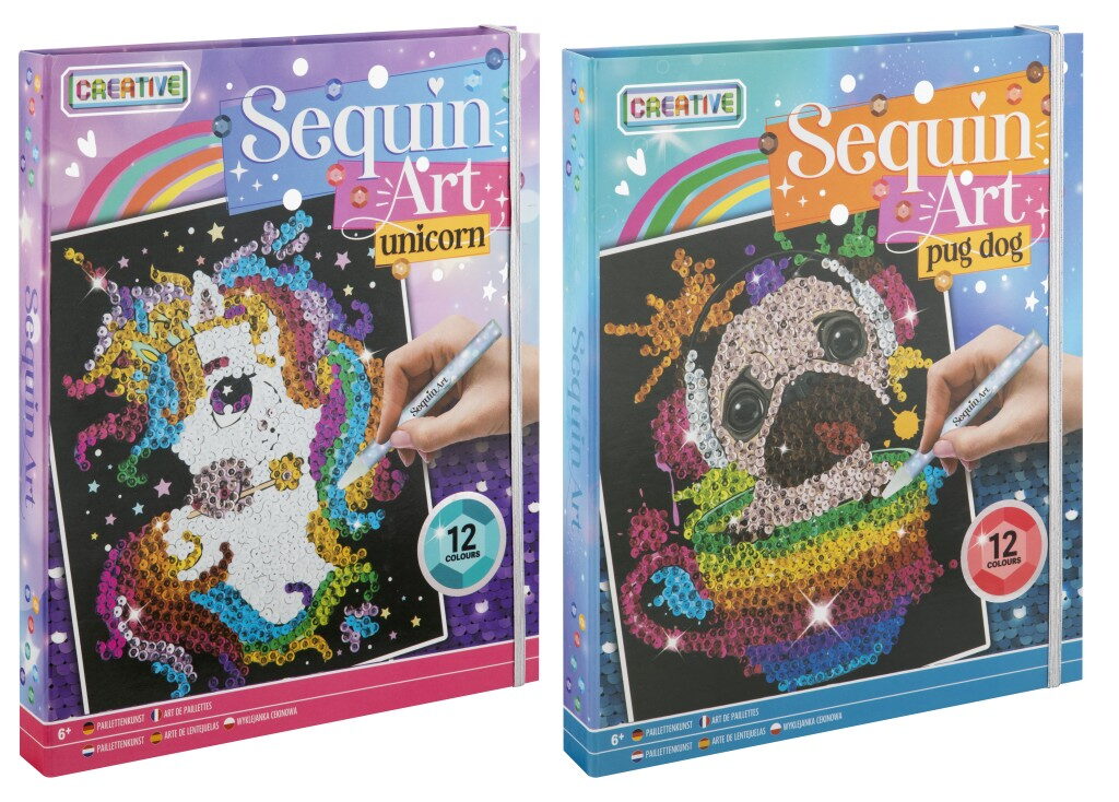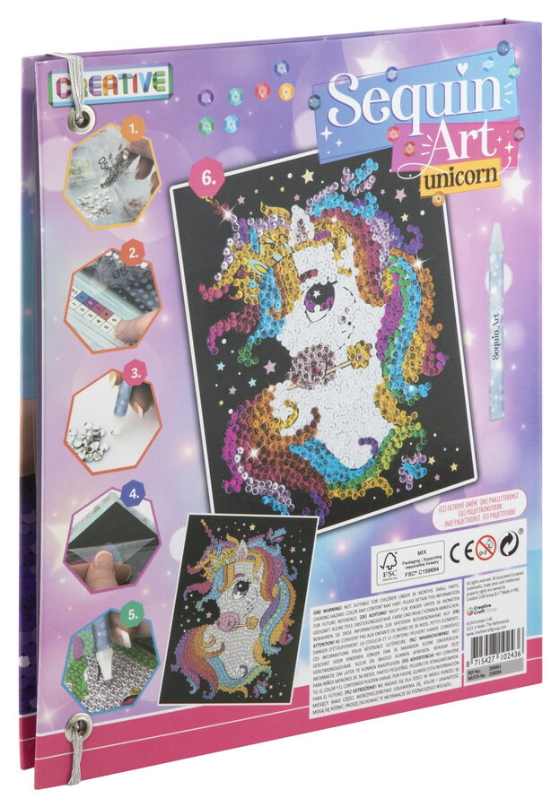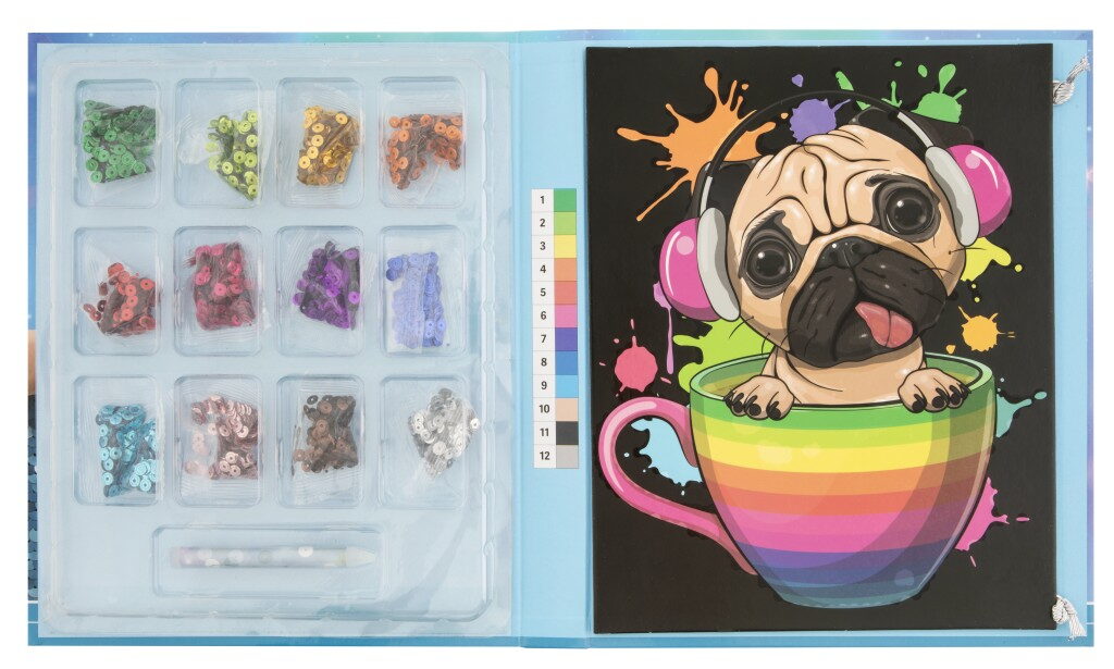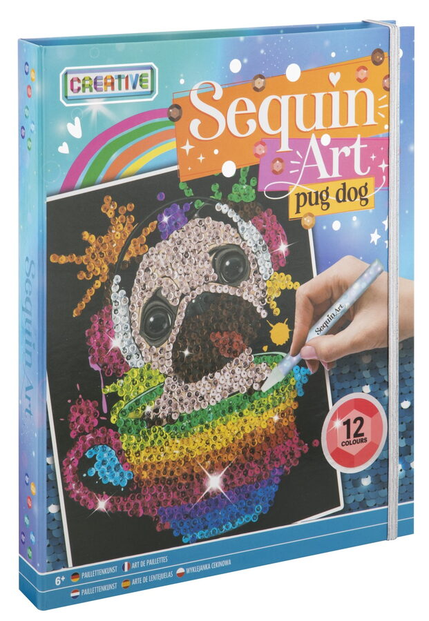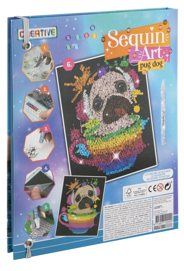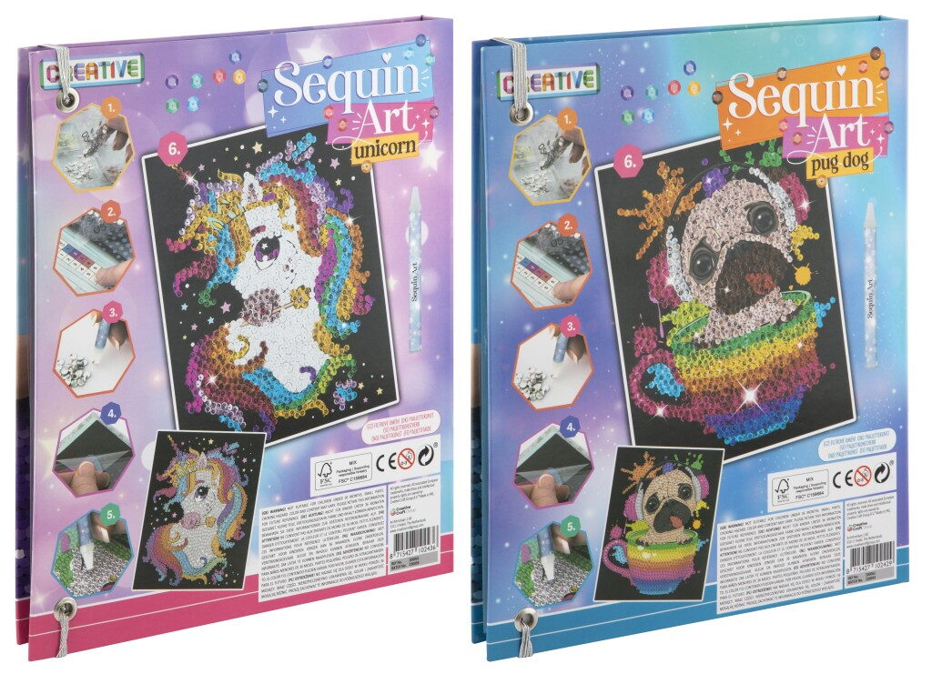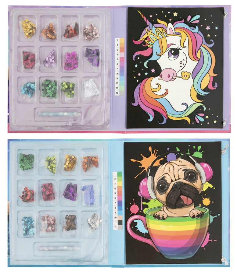 Obrázky s flitrami Sequin Art 20×25 cm – balení obsahuje obrázkek + aplikátor a 12 barev flitrů. Dva druhy – jednorožec a pejsek mopsík.