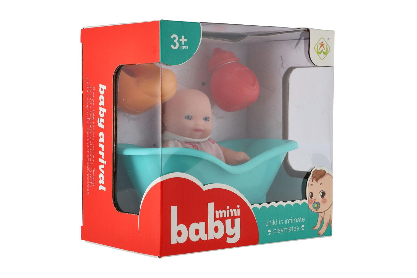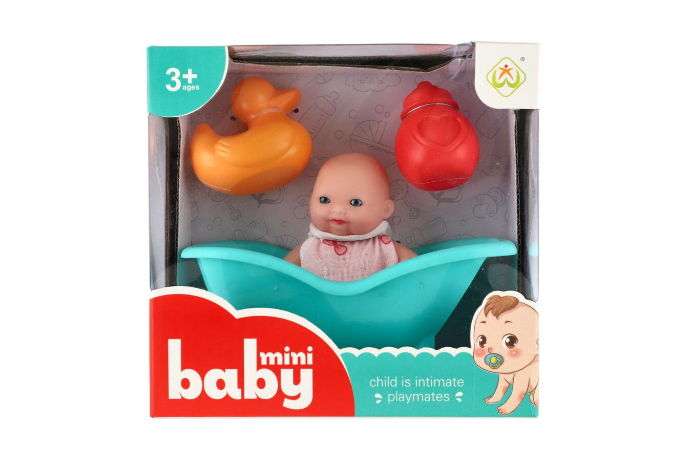 Panenka 10cm pevné tělo plast s vaničkou s doplňky v krabičce 16x15x10cm
