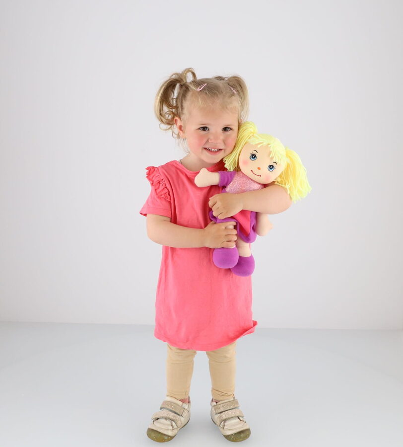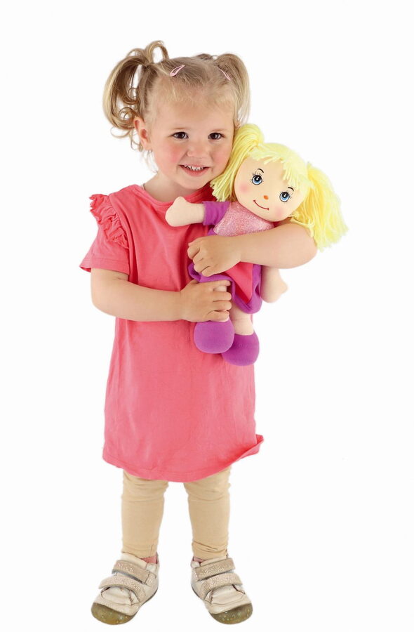 Panenka látková s blond culíky v šatičkách. Díky měkkému tělíčku i hlavičce může být kamárdkou nejen při hraní, ale také při usínání.