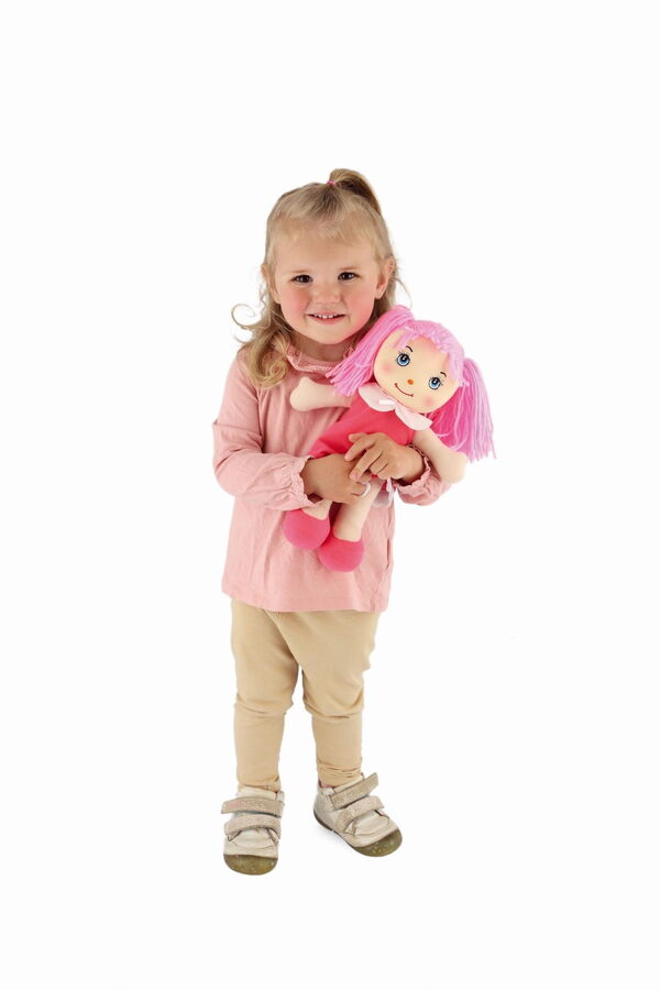 Hadrová panenka s růžovými vlásky v šatičkách má měkké tělíčko. Mazlinka bude nejlepší kamarádka nejen na mazlení, ale i ke hraní. Díky svému příjemnému materiálu a roztomilému vzhledu se stane skvělou kamarádkou pro každodenní dobrodružství i uklidňující usínání.