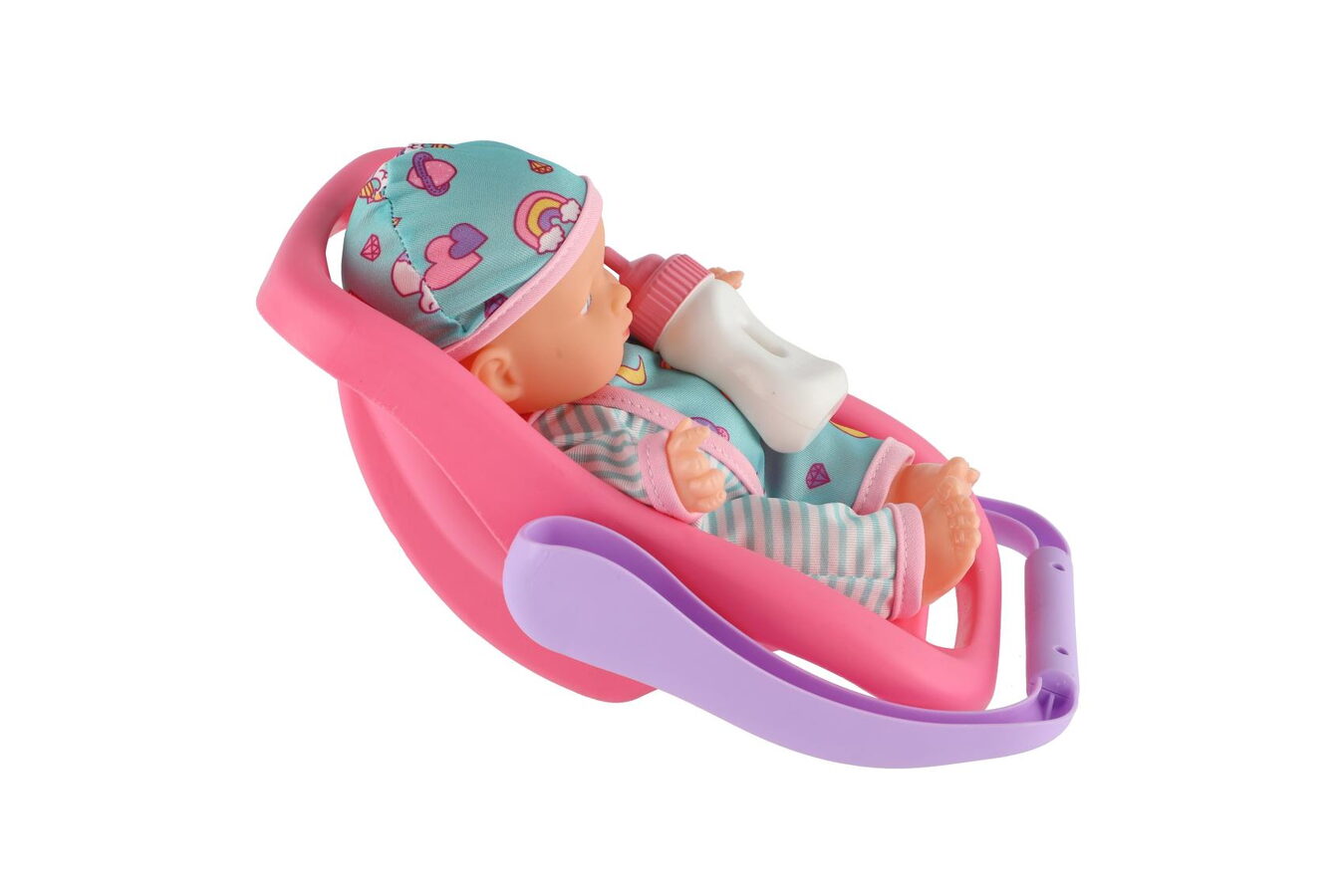 Panenka miminko 20 cm plast v nosítku/autosedačce s lahvičkou v blistru