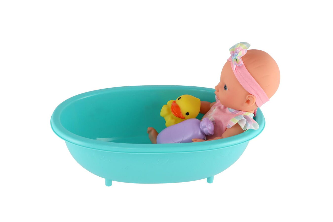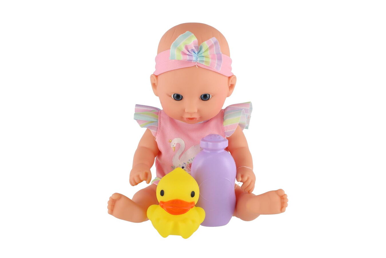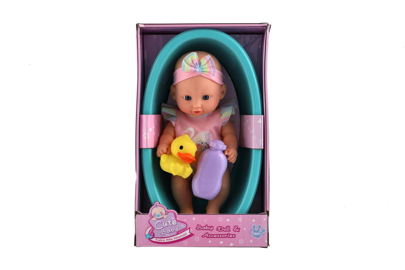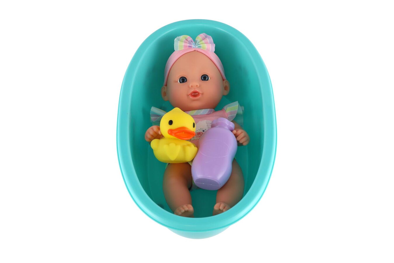 Touto panenkou zaručeně uděláte radost každé holčičce. Miminko je ve vaničce s kachničkou, což ocení každý milovník vody a koupání. A její roztomilý výraz určitě očaruje nejen malé holčičky.