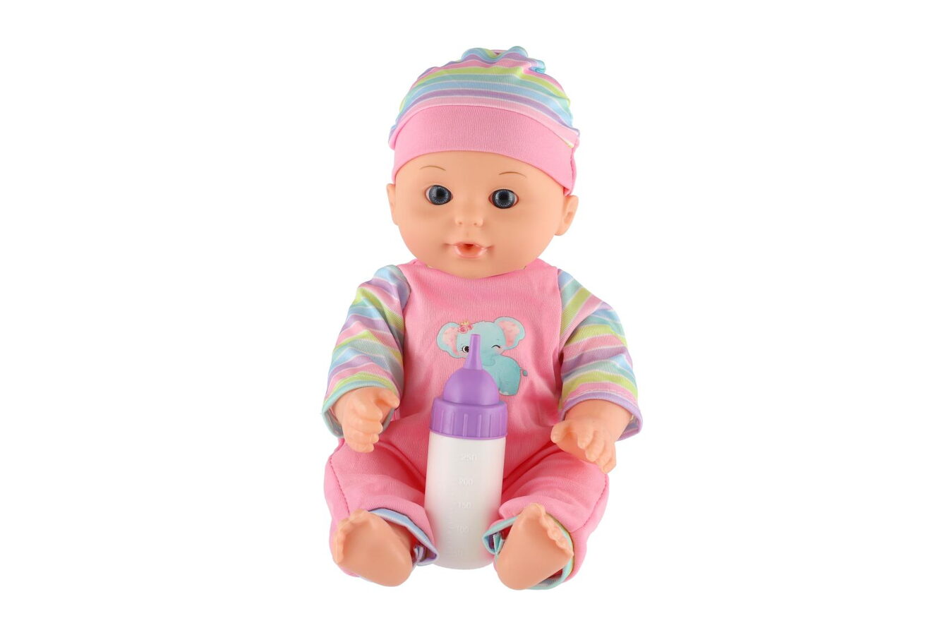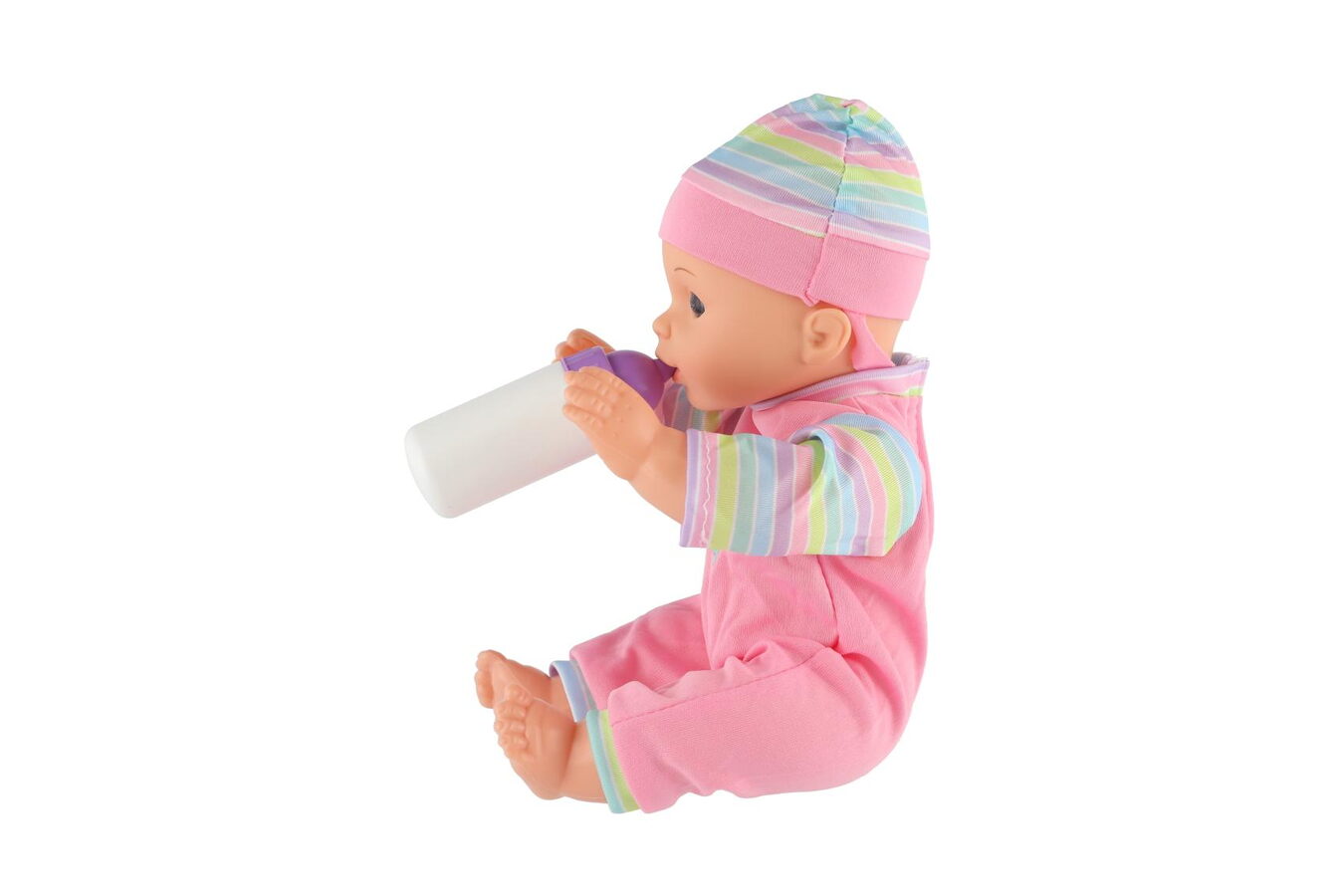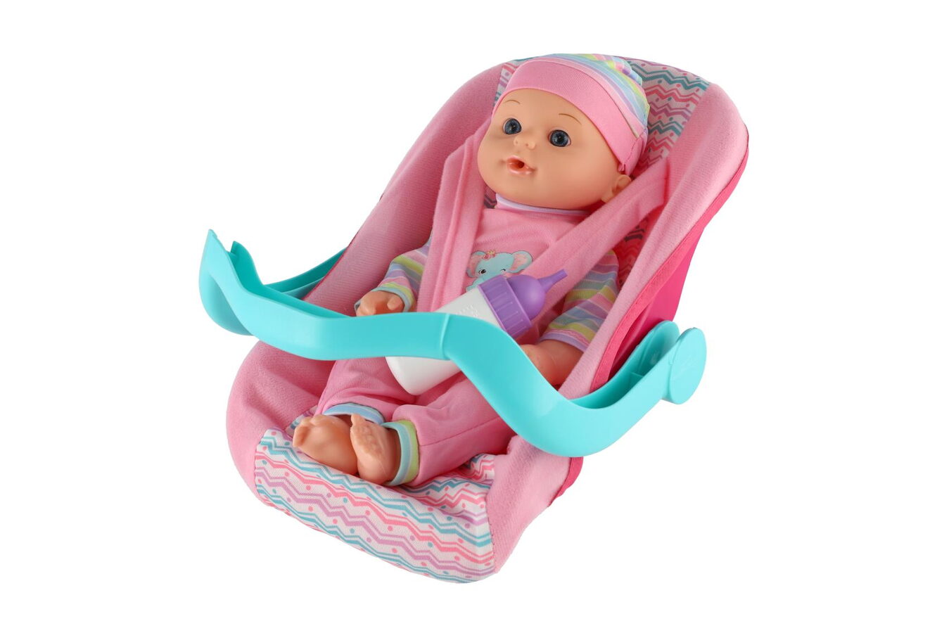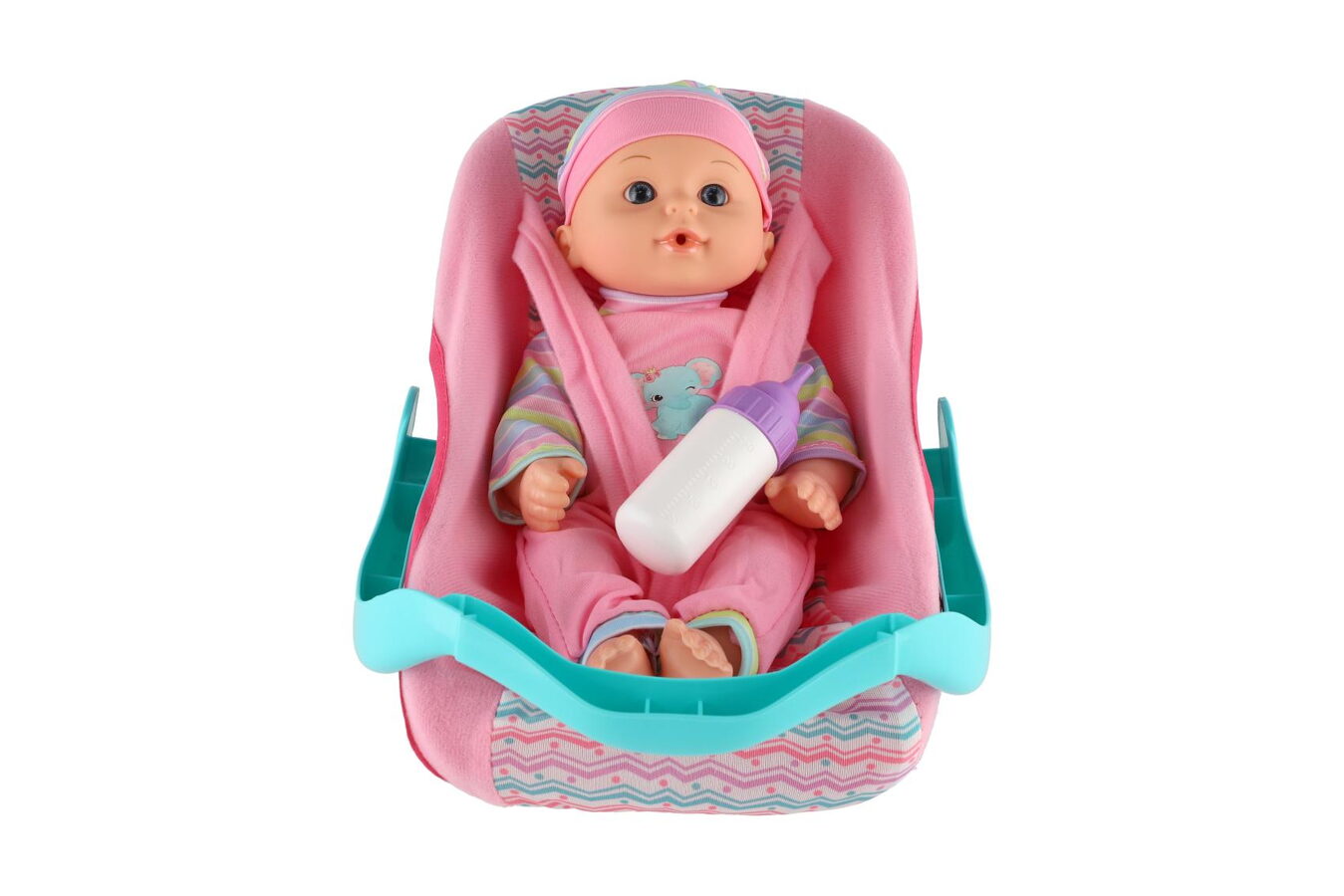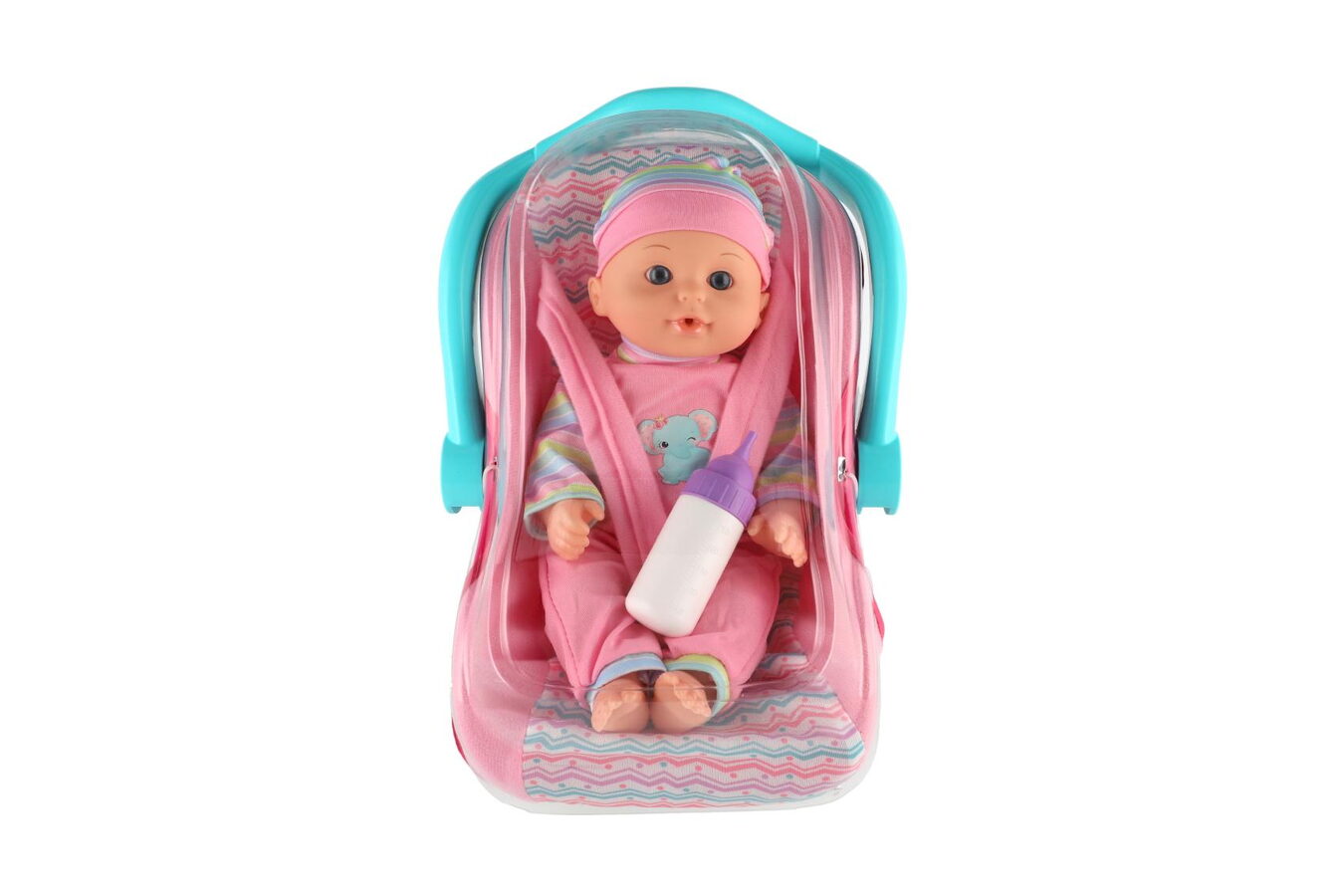 Panenka miminko 30cm plast v nosítku/autosedačce s lahvičkou v blistru