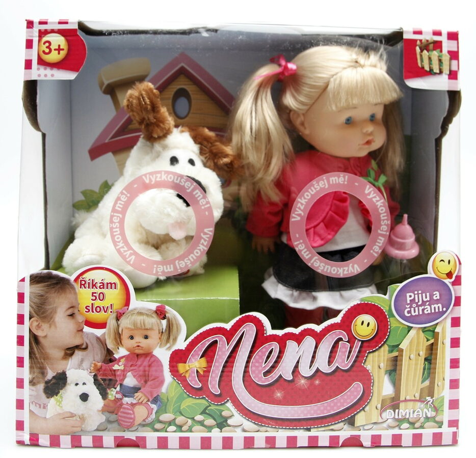 Panenka Nena je skvělá interaktivní hračka pro děti, které si chtějí hrát na maminku a starat se o své miminko. Panenka o velikosti 36 cm umí říct až 50 slov, což ji činí zábavnou a realistickou. Nena pije z lahvičky a dokáže také čůrat, což přidává na realističnosti hry. Součástí balení je kromě panenky také roztomilý pejsek a lahvička na pití, díky čemuž si děti mohou vymýšlet různé příběhy a situace, které budou obohacené o nové zážitky a radostné chvíle.