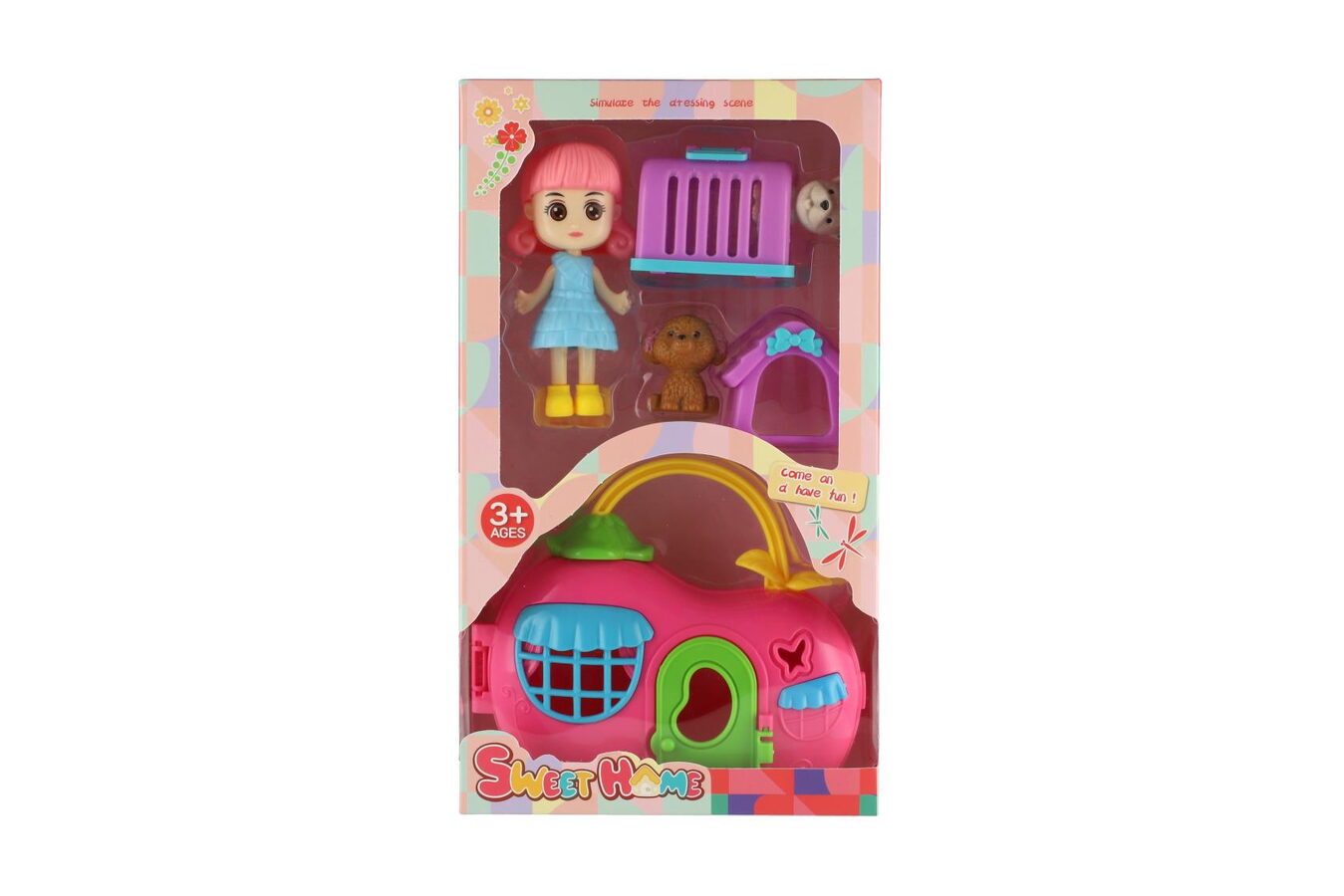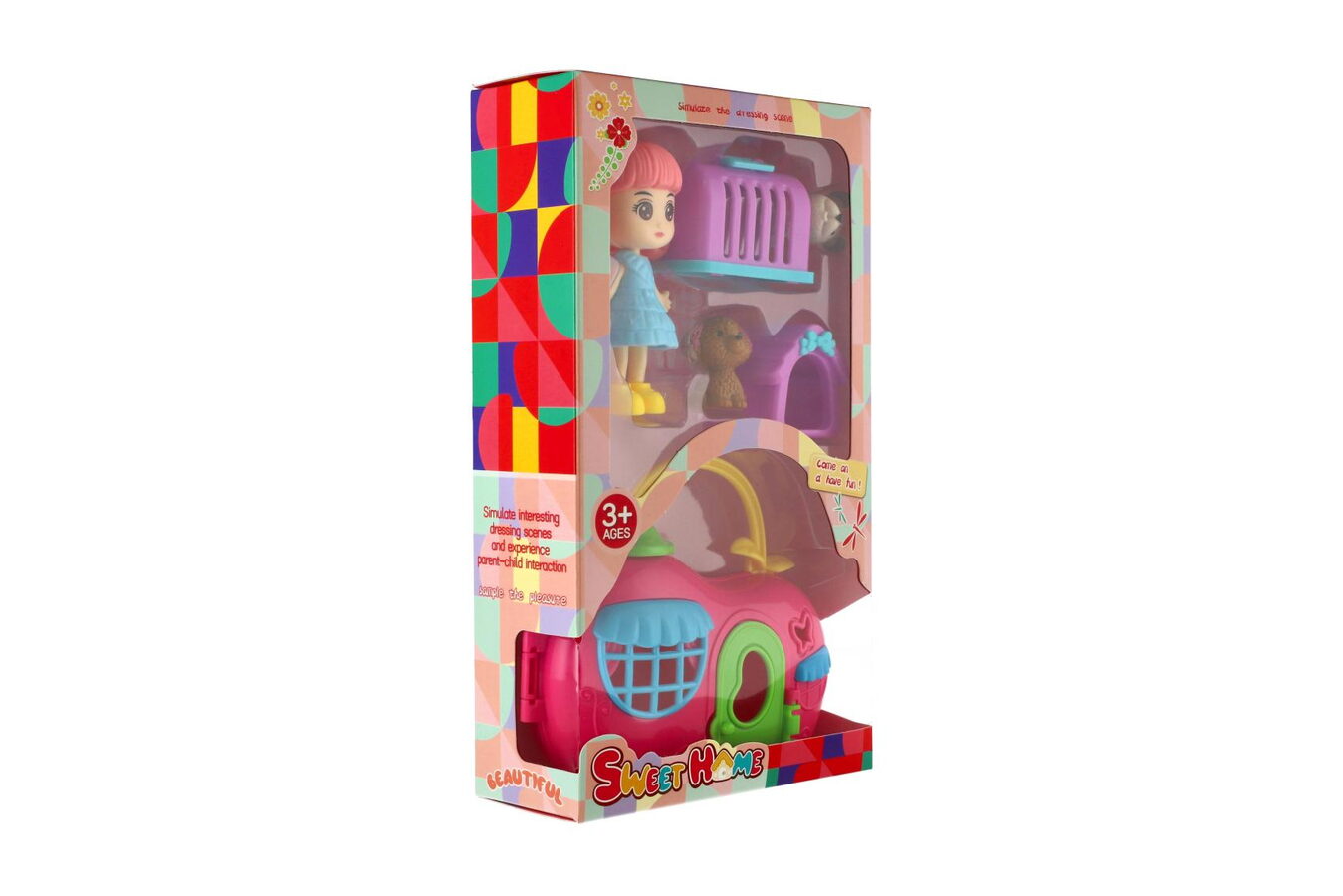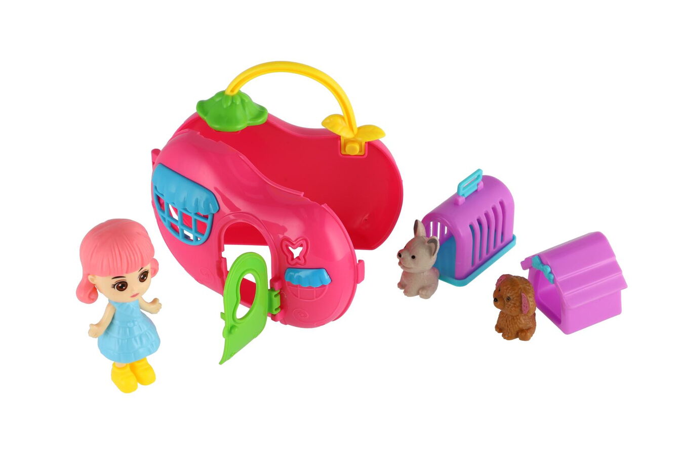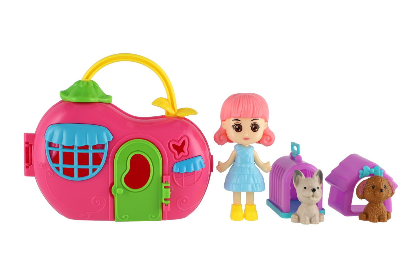 Panenka s domečkem s mazlíčky 2ks plast s doplňky v krabičce 14x24x6cm