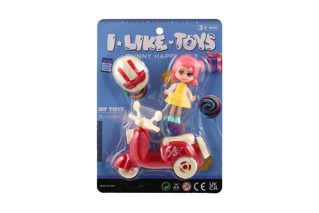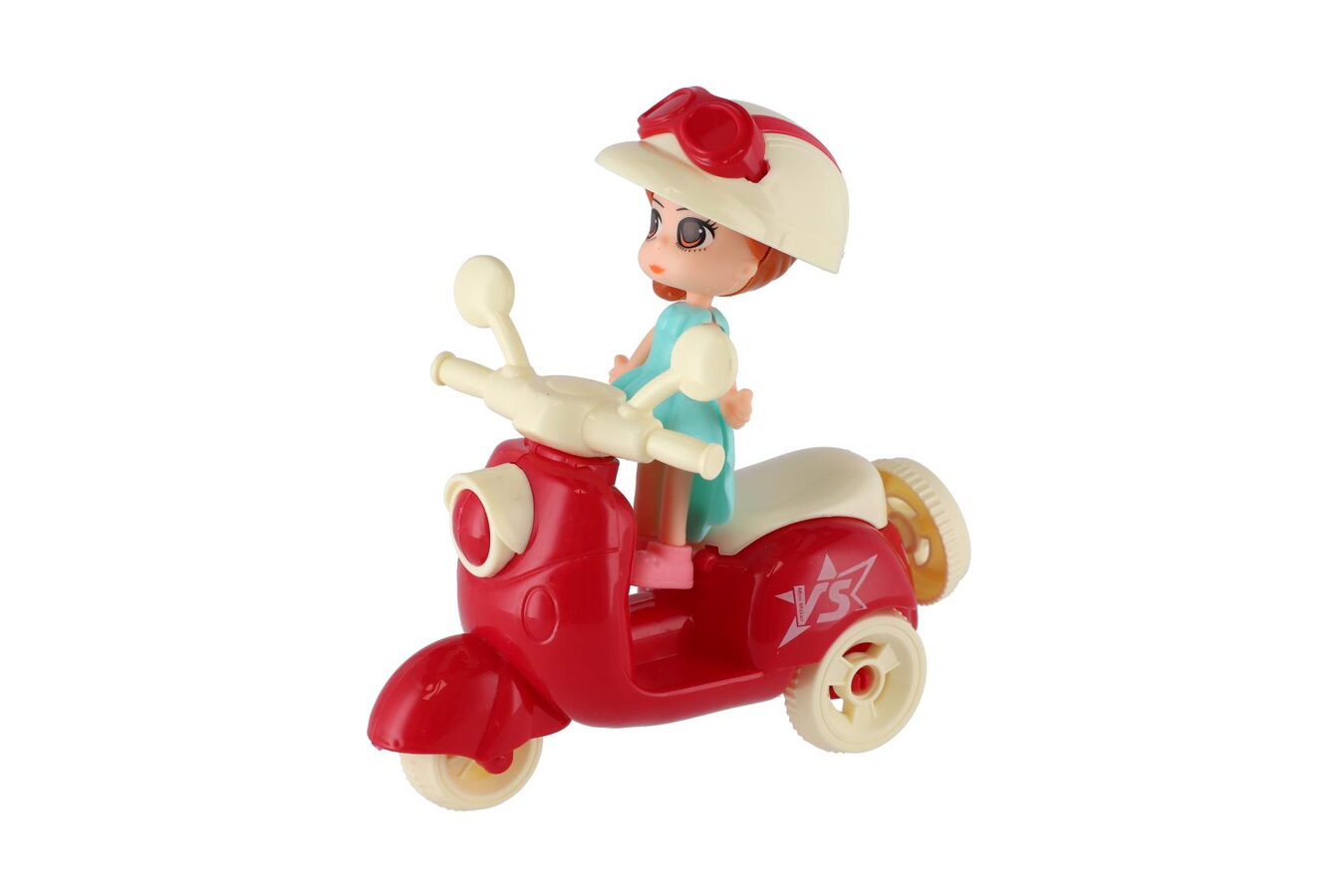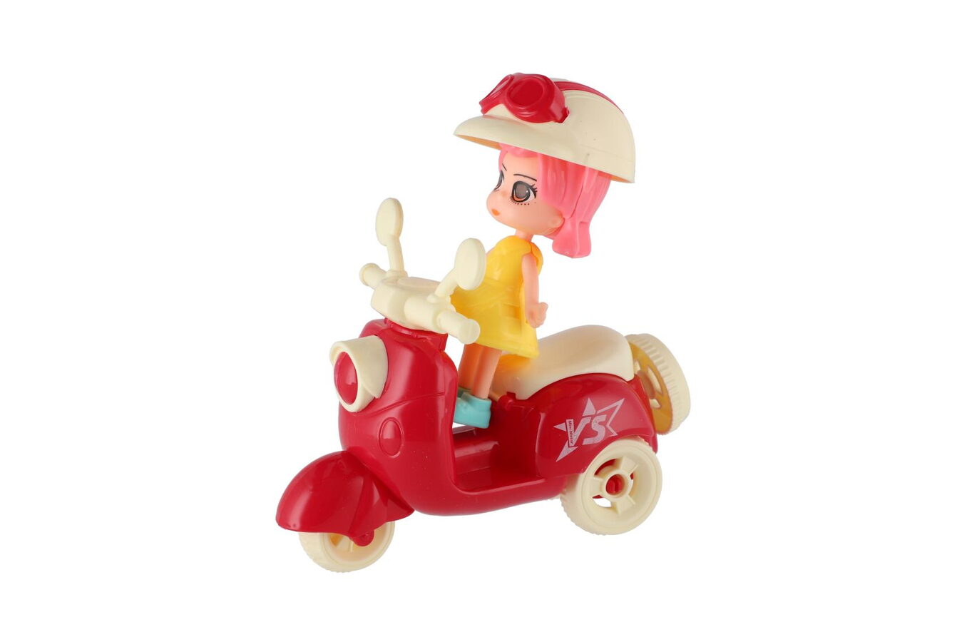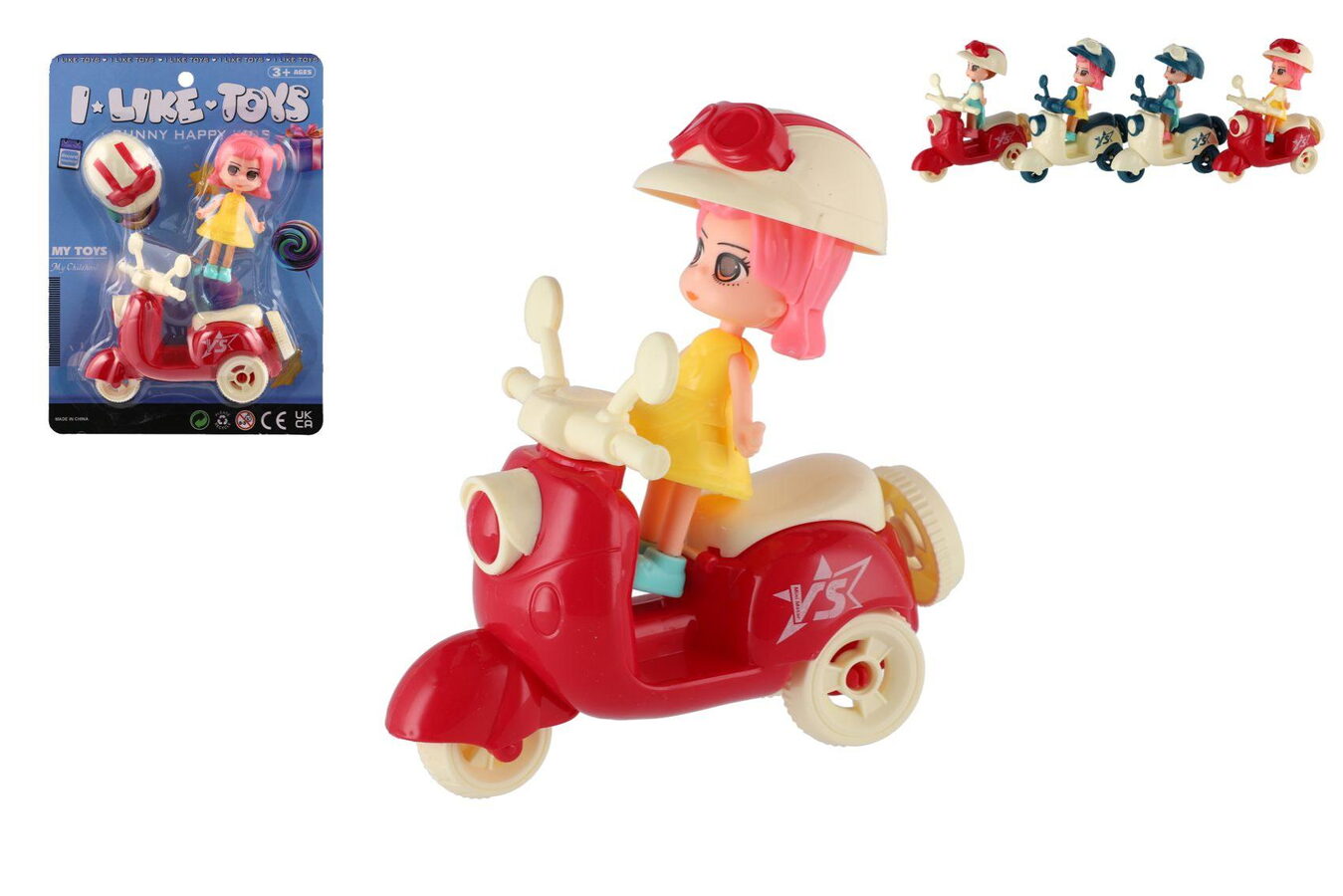 Panenka se skůtrem plast 9cm s helmou 4 barvy na kartě 18x25x5cm