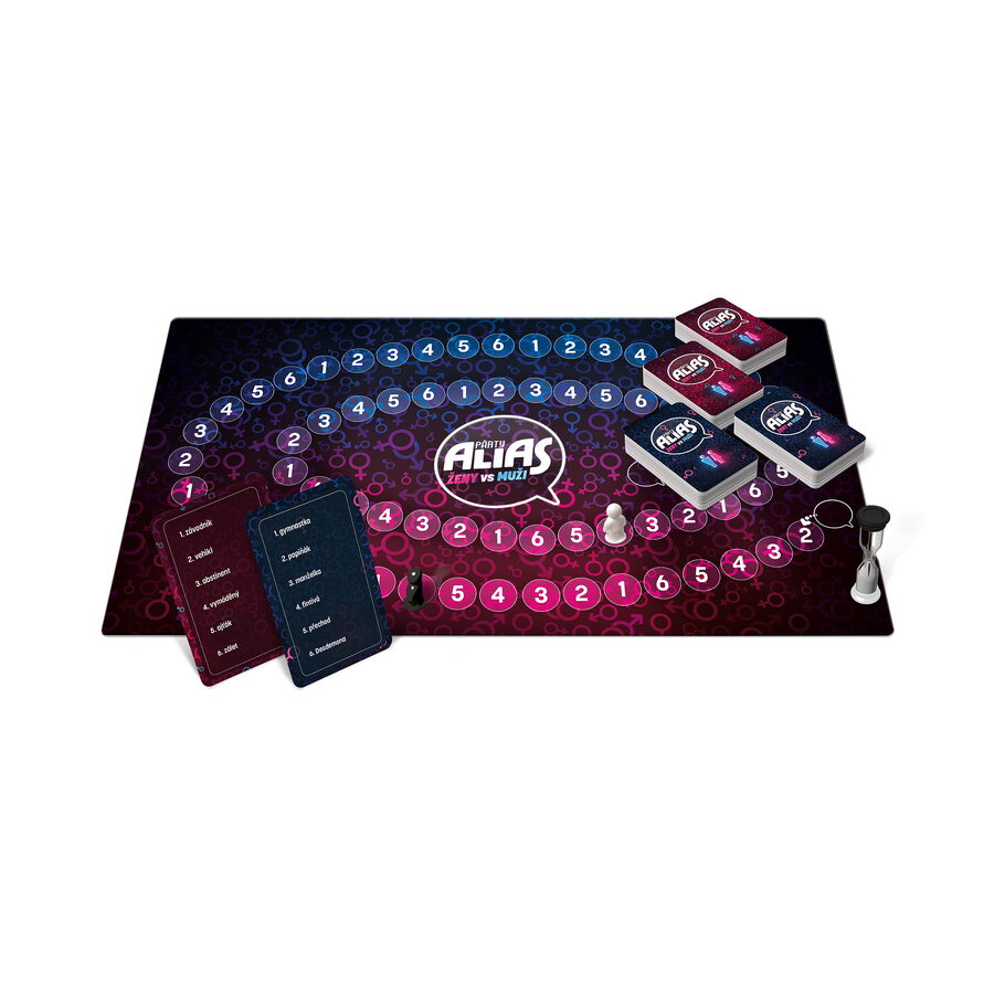 Párty Alias: Ženy vs. muži je týmová párty hra, která staví proti sobě muže a ženy. Hráči vysvětlují a hádají pojmy, které vycházejí ze světa opačného pohlaví. Díky jednoduchým pravidlům, velkému množství karet a možnosti zapojit více hráčů je hra vhodná pro oslavy, večírky i společenské akce. Hra obsahuje: herní plán, 400 karet obsahujících 2 400 slov, přesýpací hodiny, 2 figurky a pravidla.