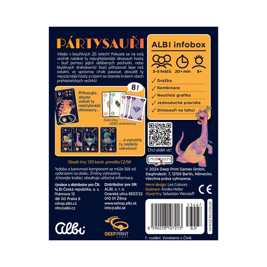 Karetní hra s atmosférou bouřlivých dvacátých let plná dražby a dinosauřích hostů. Hra Pártysauři obsahuje: 120 karet, česká a slovenská pravidla. Počet hráčů: 3-5 Doba hraní: 20+ Věk: 8+