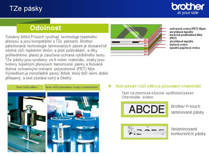 Brother patentovaná technologie laminovaných pásek je dostatečně odolná vůči teplotním vlivům a proti poškrábání, a díky průhlednému plastu je zaručena ochrana vytištěného textu. TZe pásky jsou vyrobeny ze 6 vrstev materiálu, je tenká a extrémně odolná. Znaky jsou tvořeny tepelným přenosem barvonosné pásky a fixované dvěma ochrannými vrstvami polyesterové (PET) fólie. Výsledkem je mimořádně pevný štítek, který je mimořádně odolný vůči všem vlivům okolního prostředí, drží velmi dobře přilepené, text zůstává ostrý a čitelný, i když jsou vystaveny oděru, změnám teploty, působení chemikálií a slunečnímu záření.