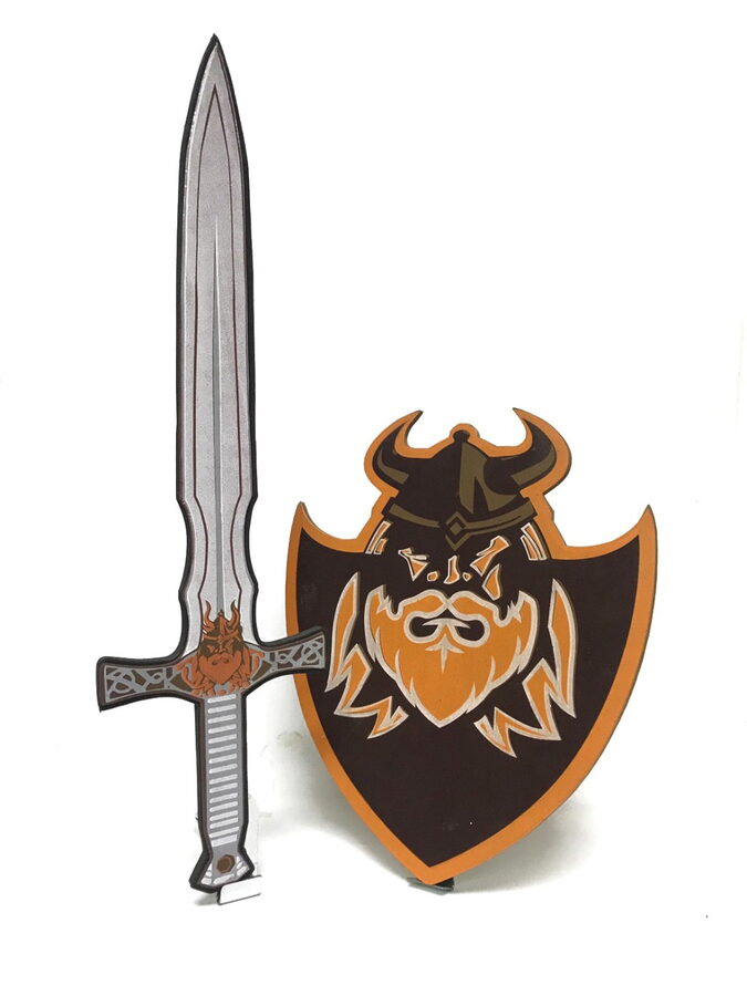 „Dětský pěnový meč a štít s motivem vikinga pro malého samuraje. Souprava je vyrobena z pěny a je velmi bezpečná. Vhodné jako doplněk ke karnevalovému kostýmu.“