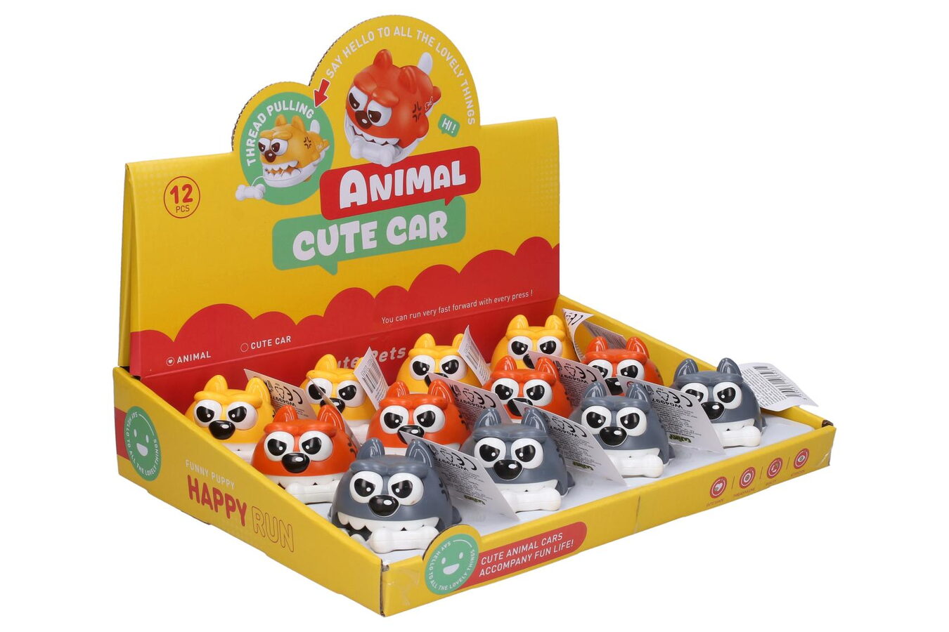 Pes s kostí natahovací. Velikost 8cm. Natahuje se zatažením za kostičku. Potom jede pes dopředu kost honí. Display box - 12 ks. 3 varianty - šedá, oranžová, žlutá.