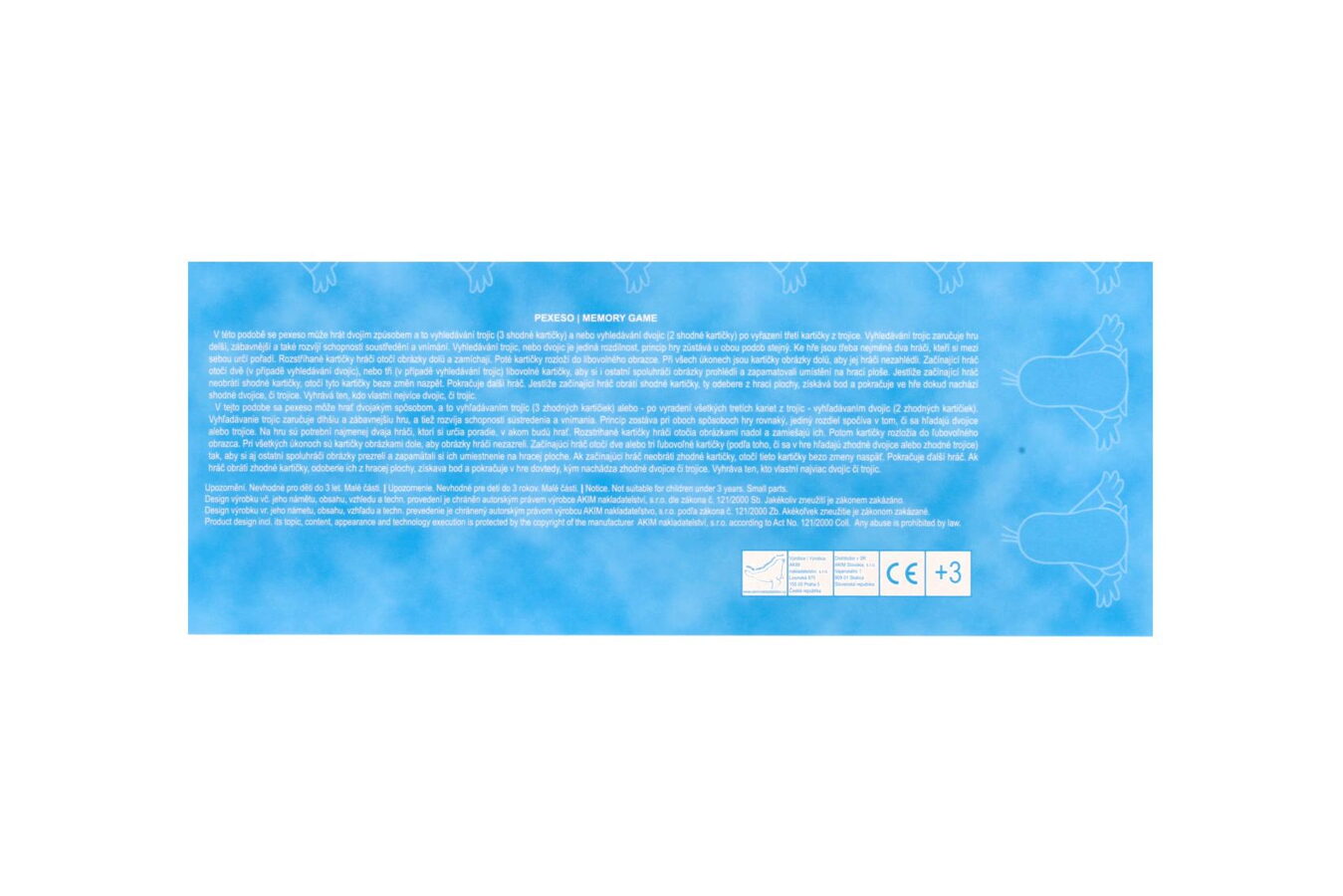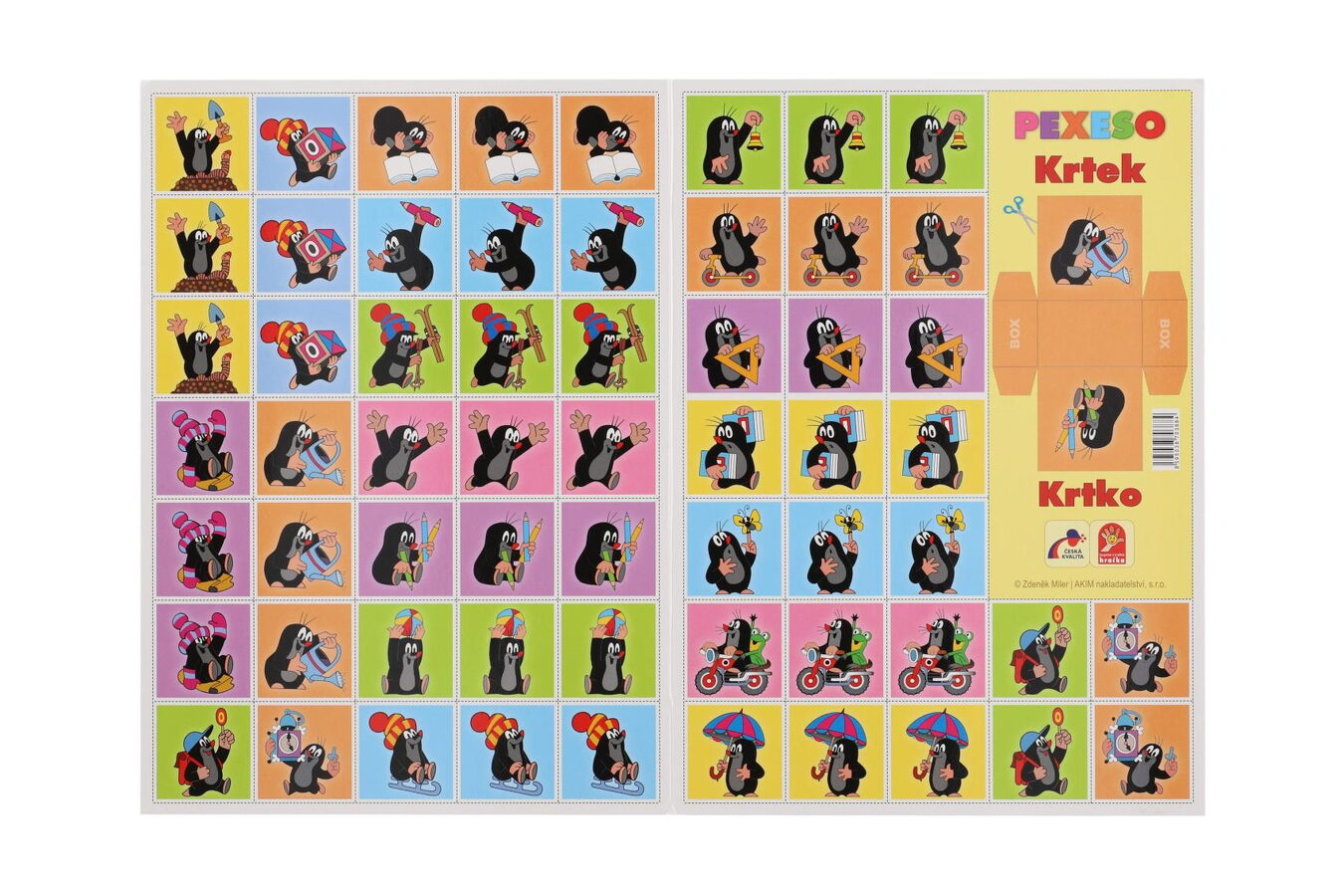 Pevný karton s lesklou voděodpudivou povrchovou úpravou, 60 kartiček/20 trojic/ velikost kartiček 4 x 4 cm (š x d), na pexesech u titulního obrázku umístěn box k vystřižení pro možnost vložení vystřižených kartiček.