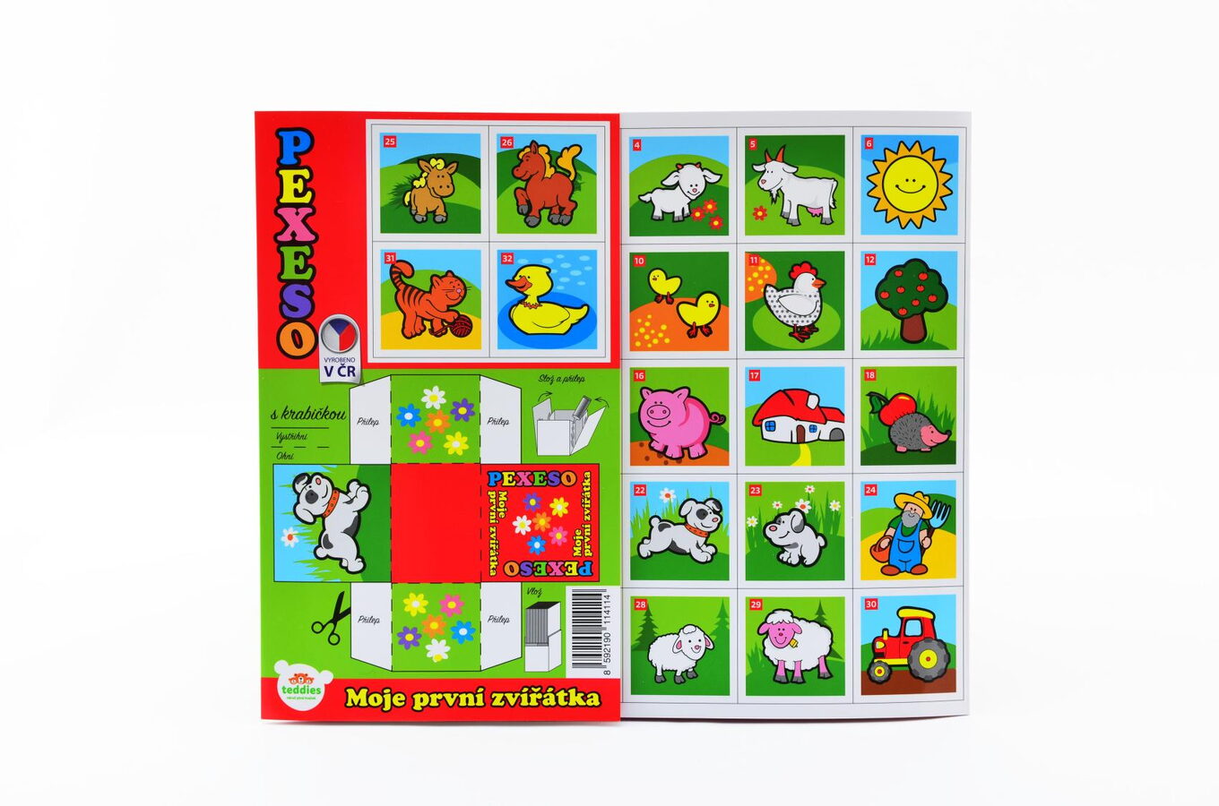 Vystřihovací pexeso s motivem domácích zvířátek. Po vystřižení získáte 32 kartiček. Součástí je návod ke hře a praktická papírová krabička.