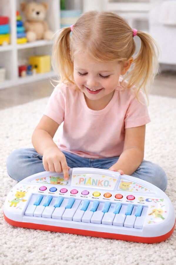 Barevné dětské piánko s roztomilými motivy zvířátek je ideální první hudební hračka pro nejmenší děti. Piánko nabízí jednoduché ovládání, příjemné zvuky a veselé melodie, které podporují rozvoj hudebního sluchu, rytmu a jemné motoriky.