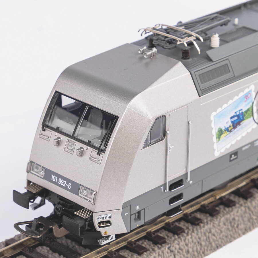 Propracovaný model elektrické lokomotivy BR 101 vydaný v limitované sérii při příležitosti 30. výročí založení společnosti PIKO Spielwaren GmbH. Nabízí atraktivní lakování a potisk, díky kterému se bude stroj vyjímat jak na kolejišti, tak ve vitríně. Ve věrně ztvárněné, přísně aerodynamické karoserii s bočními kryty podvozku vynikají do nejmenších podrobností zpracované detaily madel, stupínků a plošinek. Výlisek střechy neopomíjí žádnou maličkost a zdobí jej samozřejmě obráceně orientované jednoramenné pantografy typické pro tento typ lokomotiv.Předobraz modelu proslul svým výkonem a spolehlivostí, pro tyto vlastnosti se mu přezdívá „žrout kilometrů“. Miniatura jde zcela ve stopách své předlohy a nabízí výkonný motor opatřený hned dvěma setrvačníky zajišťujícími plynulé změny rychlosti. Moment je přenášen uhlopříčně uspořádanými bandážovanými koly na vnitřních nápravách podvozku, poháněné jsou však všechny čtyři nápravy. Věrně ztvárněno je funkční směrové osvětlení s trojicemi světlometů na čelech, barva světel se mění v závislosti na směru jízdy. Atraktivně osvětlená je také kabina stroje, která je připravena k vestavbě digitálního ovládání umožňujícího přepínání mezi stropním světlem a osvětlením řídícího pultu. Model je možno rozšířit zvlášť určeným digitálním dekodérem se zvukovým modulem a reproduktorem. Hlavní vlastnosti: analogové ovládánínapájení DCčtveřice nápravmotor s dvojicí setrvačníkůdvojice bandážovaných hnacích kolsvětla s přepínáním barvy dle směru jízdyosvětlení kabiny strojvedoucíhodvojice pantografůrozhraní PluX22 dle NEM 658šachta dle NEM 362 s kinematikou krátkého spřáhla Dokumentace: brožura k jubilejním modelům lokomotiv BR 101 „Pozdrav ze Sonnebergu“ (DE)brožura k jubilejním modelům lokomotiv BR 101 „Pozdrav ze Sonnebergu“ (EN)obecné informace k modelům lokomotiv BR 101 řady Expert (DE, EN, FR, NL)návod k obsluze a seznam náhradních dílů modelu č. 51110 (DE, EN, FR, NL) Vlog Dr. René F. Wilfera k příležitosti 30. výročí založení PIKO Spielwaren GmbH.