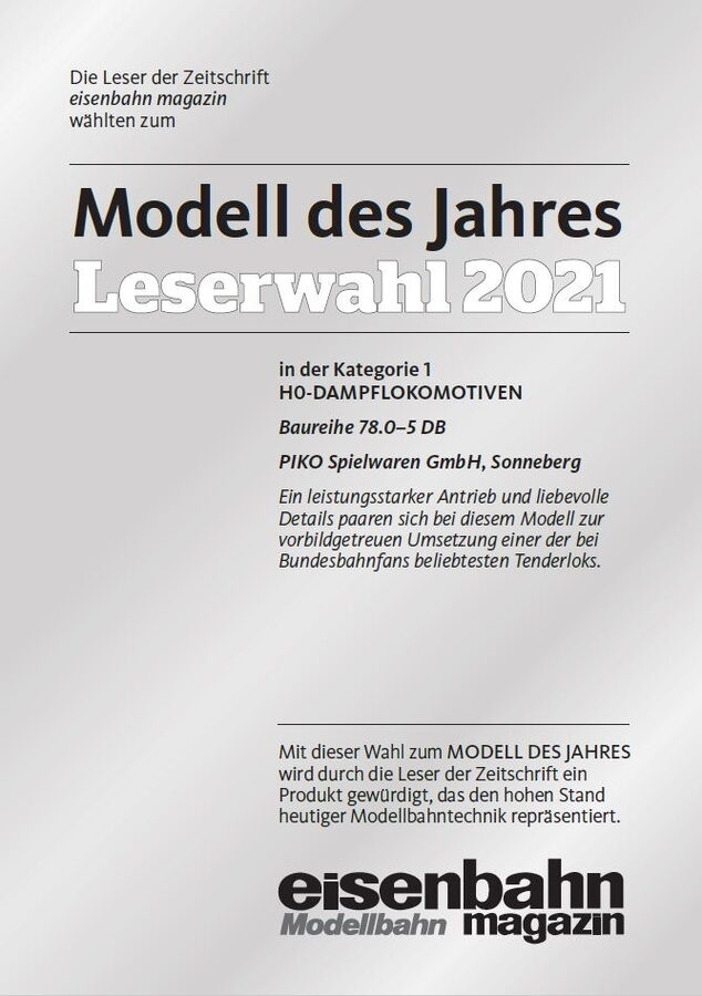 Přichází moderní nástupce velmi oblíbené a dříve hojně rozšířené lokomotivy řady BR 78 v podobě zcela nové konstrukce z dílny PIKO a zároveň první parní lokomotiva v produktové řadě Expert. Tento model nastavuje laťku kvality v řadě Expert ještě výše. Téměř všechna potrubí jsou vedena samostatně, kabina strojvedoucího, vodní nádrže a dýmnice jsou detailně zpracovány s jemnými imitacemi nýtových hlav. Paprsky kol a parní rozvod jsou vyrobeny z vysoce kvalitních materiálů a působí mimořádně jemně. Skvělé jízdní vlastnosti zajišťuje 5pólový motor PIKO se setrvačníkem. Přídavná závaží v kotli a dva bandážované nápravové prstence se starají o vysokou tažnou sílu. Díky modernímu rozhraní PluX22 je dodatečná instalace dekodéru velmi snadná. Stejně jednoduše lze doplnit reproduktor a kouřový generátor. O autentickou provozní atmosféru se stará LED osvětlení závislé na směru jízdy. Specifikace: napájení DCanalogové ovládání délka s nárazníky 170 mmšachta NEM minimální rádius 422 mm2 trakční pneumatikydigitální rozhraní NEM 658 PluX22zvuk – ne, dodatečná montáž zvukového dekodéru PIKO - číslo položky 56584 venkovní osvětlení - bílá/červená svítí v závislosti na směru jízdydodatečná montáž funkce páry – číslo položky 56163 digitálně přepínatelné osvětlení kabiny a osvětlení topeniště (s dekodérem PluX22) Hlavní vlastnosti: realistické barevné provedenídetailní zpracováníatraktivní design