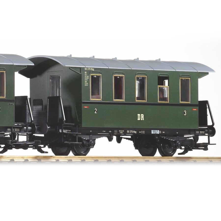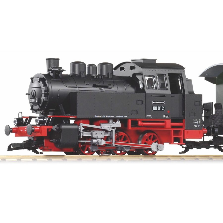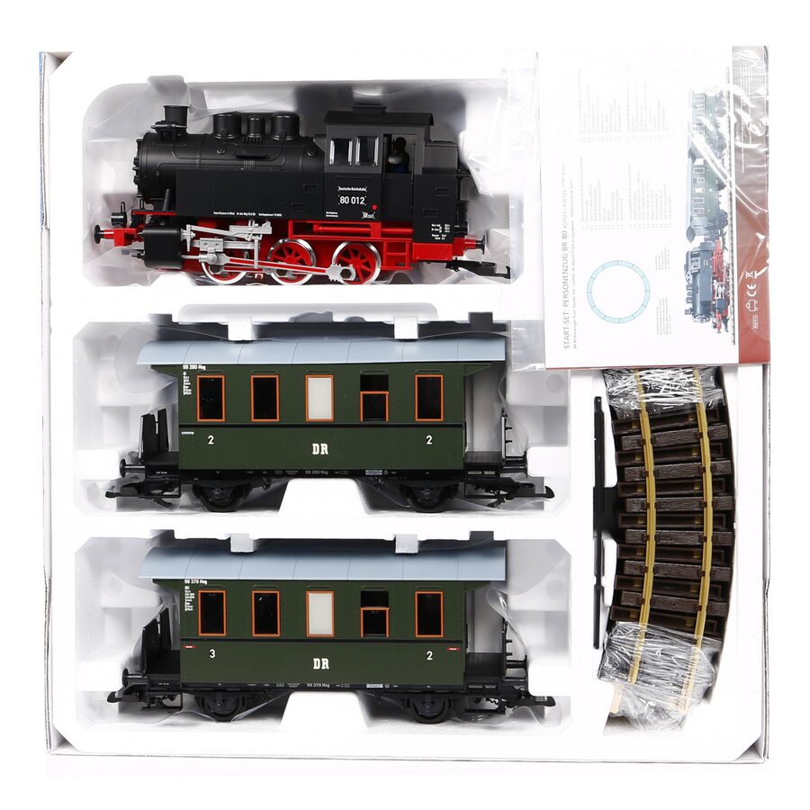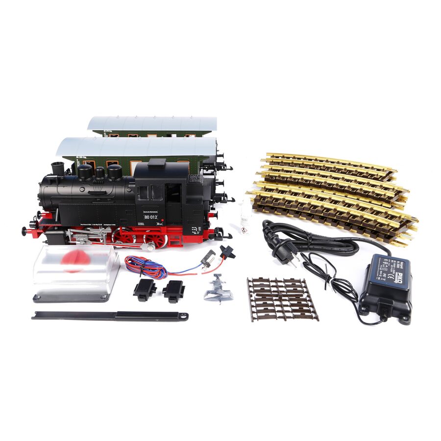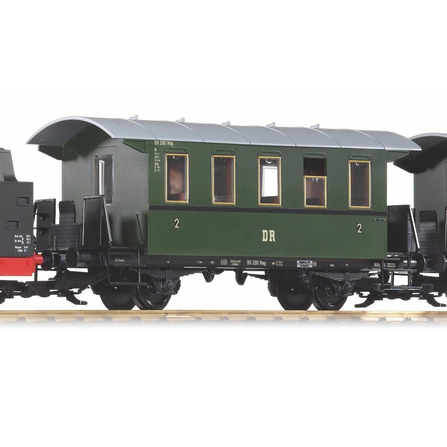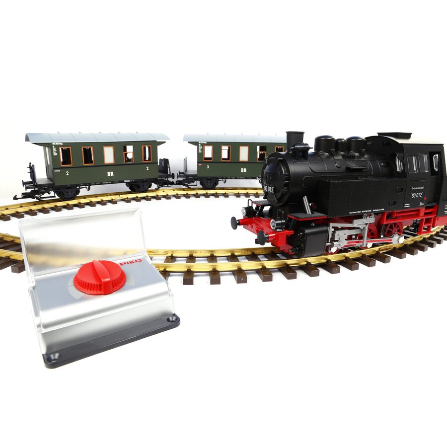 Video je pouze ilustrační, zobrazuje příbuzný produkt. Co je malé, to je hezké, ale co je větší, to je lepší. A když vlak, tak gigantický! Modely měřítka G od firmy PIKO představují mimořádně hodnotné hračky, které přivádějí v úžas fanoušky techniky napříč generacemi. Vydejte se na fantastickou jízdu těmi nejmohutnějšími stroji, omráčí Vás silou motorů a váhou poctivé porce masivního kovu. Podnikněte cestu ke kořenům modelové železnice a odhalte působivý odkaz hračkářů staré školy! Vláčky tohoto měřítka nejsou jen velké, ale také nebývale robustní. Jsou navrženy a zhotoveny tak, aby vydržely hrubší zacházení a umožňovaly provozovat trať na zahradě i za nepříznivého počasí. Otevírají se tak široké možnosti nevídaným zážitkům, vypravte vlak na cestu zasněženou krajinou! Nemusíte se přitom bát složitého sestavování a zapojování. Kolejnice a vagónky lze snadno spojit nebo uklidit. Přehledně značené ovládací i napájecí prvky jednoduše připojíte bez použití jakéhokoliv nářadí. Vysoké životnosti dopomáhají kuličková ložiska, chromované díly, vysoce kvalitní, barevně stálé plasty a spolehlivé krytí motorů i zařízení obsluhy. Modely jsou vyráběny v souladu s nejpřísnějšími evropskými standardy a předpisy, v domovské továrně firmy PIKO, v německém Sonnebergu. *?* Ukázka zvuku zabudovaného zvukového modulu. Startovací sada soupravy osobního vlaku skládající se z parní lokomotivy BR 80 a dvou osobních vozů 2. třídy v provedení DR. Lokomotiva má chromovaná dvojkolí a je vybavena kuličkovými ložisky. Disponuje osvětlením měnícím se v závislosti na směru jízdy, analogově ovládaným zvukem a spínatelným výrobníkem kouře. Zvuk je ovládán dvojicí traťových spínacích magnetů, které jsou součástí balení. Sada také zahrnuje hůlku k rozpojení spřáhel, sloužící k odpojování a připojování vozů. Nákup sady je vhodné doplnit o příslušný spotřební materiál. Plocha základny: 130x130 cmMinimální konstrukční plocha: 150x150 cm Hlavní vlastnosti: trojice náprav (lokomotiva)zvukový modulvýrobník kouřesvětla bílé barvy s přepínáním dle směru jízdydvojice náprav (vagony)vhodné i do exteriéruvyrobeno v Německu Tato sada obsahuje: parní lokomotiva BR 80 DR III se zvukovým modulem a výrobníkem dýmu (1 ks)osobní vagon 2. tř. DR III (2 ks)kolej oblouková G-R1 - 35211 (12 ks)připojovací svorka s kabelem - 35270 (1 ks)balení 14 ks kolejových spojek - 35285 (1 ks)základní analogový ovladač - 35006 (1 ks)základní napájecí zdroj - 35005 (1 ks)traťový spínací magnet - 35268 (2 ks)hůlka k rozpojení spřáhel - 36039 (1 ks)přípravek k výrobě kouře (10ml) (1 ks) Dokumentace: návod k obsluze soupravy č. 37125 (DE, EN, F, NL) obecný návod k obsluze G startovacích sad PIKO (DE, EN, F, NL)detail rozměrů lokomotivy BR 80 (DE)bezpečnostní list přípravku pro výrobník kouře (EN)specifikace napájecího zdroje (DE, EN, F, NL, E, ITA, SWE, DK)