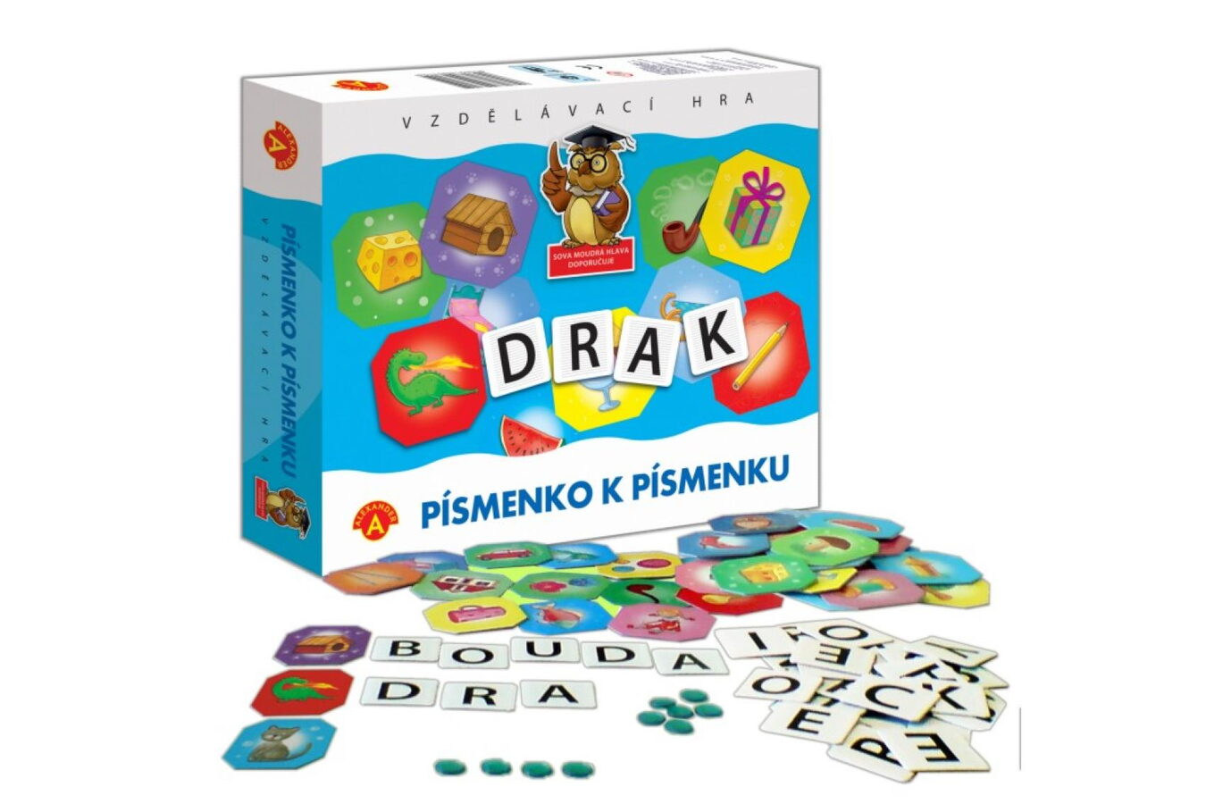 Obsahuje 35 obrázků, 36 písmen, 30 žetonů a návod.