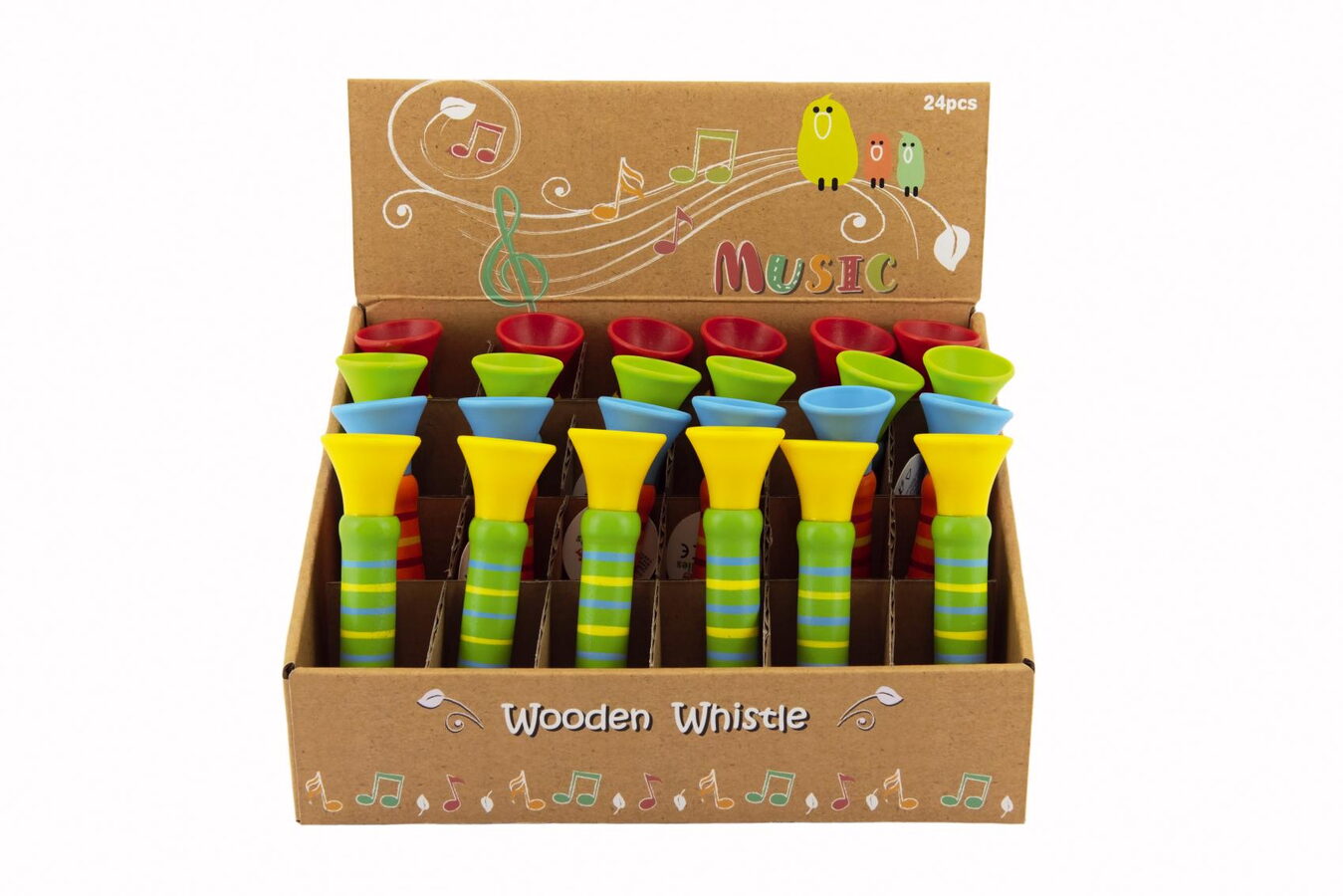 Teddies Píšťalka dřevěná barevná 12 cm 4 barvy 24ks v boxu 18m+