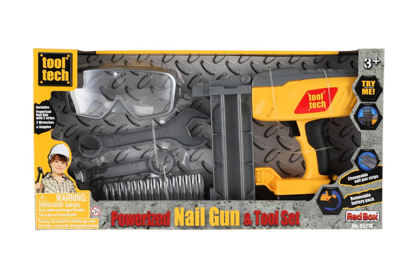 Nádherná sada pro malé kutily. Souprava obsahuje ochranné brýle, klíče, plastové náboje hřebíky a samozřejmě nastřelovací pistoli. Užijete si tak spoustu zábavy při drobných opravách. Pistole má vyjímatelný pack, kde jsou uloženy baterie. Baterie 2x AA jsou součástí balení.