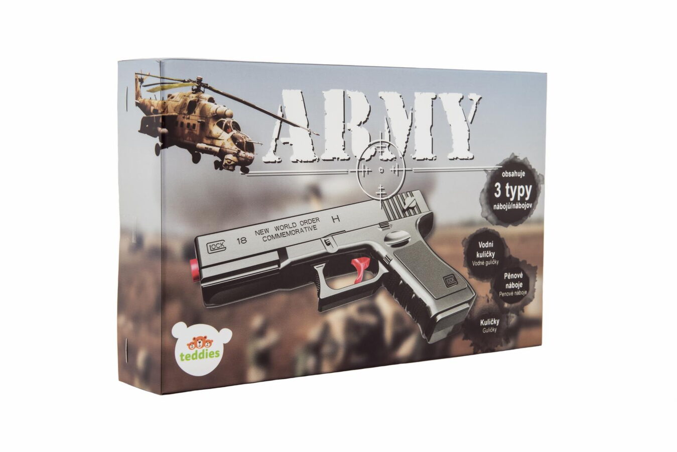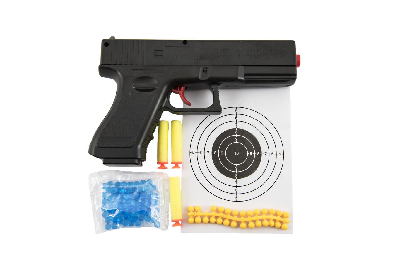 Hravá zábava především pro kluky! Pistole na pěnové náboje, vodní i gumové kuličky zabaví každého pistolníka. Vlož kuličky, nabij, zamiř a střílej. Velikost kuliček je 6 mm.