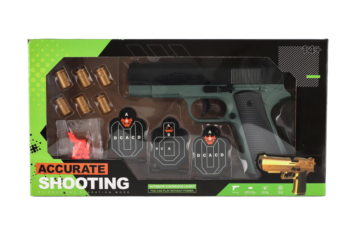Pistole na pěnové náboje plast 19cm + terče 3ks, náboje 6ks v krabici 34x18x4,5cm