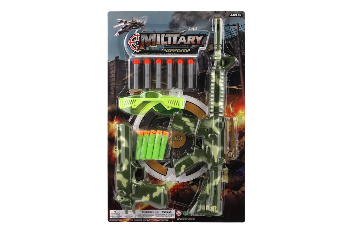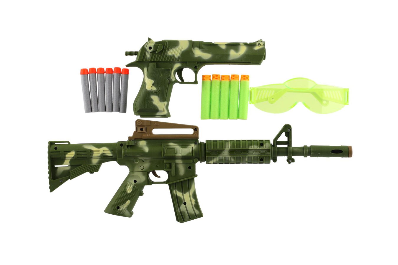 S touto puškou se staneš opravdovým lovcem. Najdi co nejlepší skrýš, přesně zamiř a pal! Puška má odnímatelný zaměřovač, součástí je 11 pěnových nábojů, pistol a brýle.