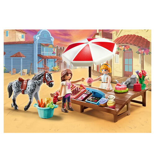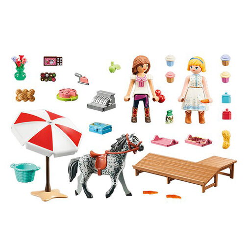 Cukrárna v Miradero je nejlepším místem na sladkou odměnu po dlouhém dni. Koláče a sladké pečivo jsou voňavé a připravené na prodejním stole. S tak velkým výběrem není pro nikoho snadné se rozhodnout. Abigail miluje sladké, a tak by ráda vyzkoušela všech. 50 dílků – figurky Lucky a Abigail, kůň, stánek s cukrovinami, košíčky, dorty, pečivo, pokladna a další doplňky.