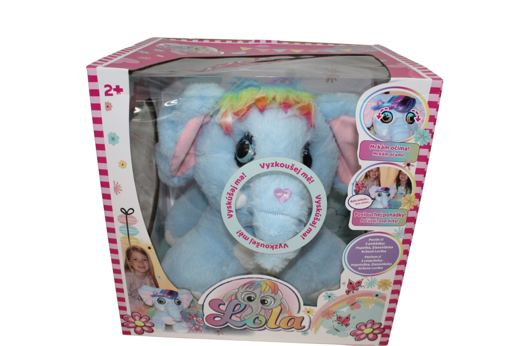Dotkni se chobotu a zažij kouzlo! Třpytivé oči se začnou pohybovat a Lola začne vyprávět pohádky nebo roztomilé fráze – vše v češtině, přibližně po dobu 3 minut. Lola je navíc oblečena do šatiček pro ještě větší zábavu. Hebký plyšový materiál Aktivace dotykem na chobotu Pohyblivé třpytivé oči Mluví česky – pohádky: Na Vlásku, Zlatovláska, Popelka