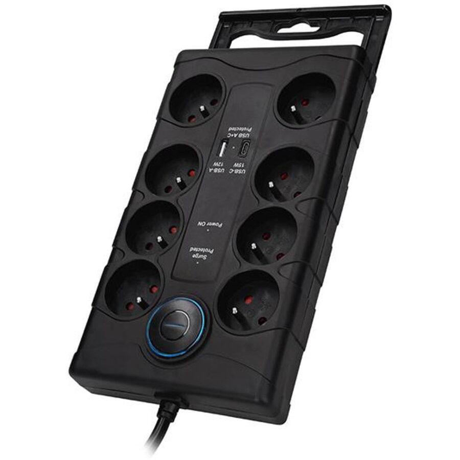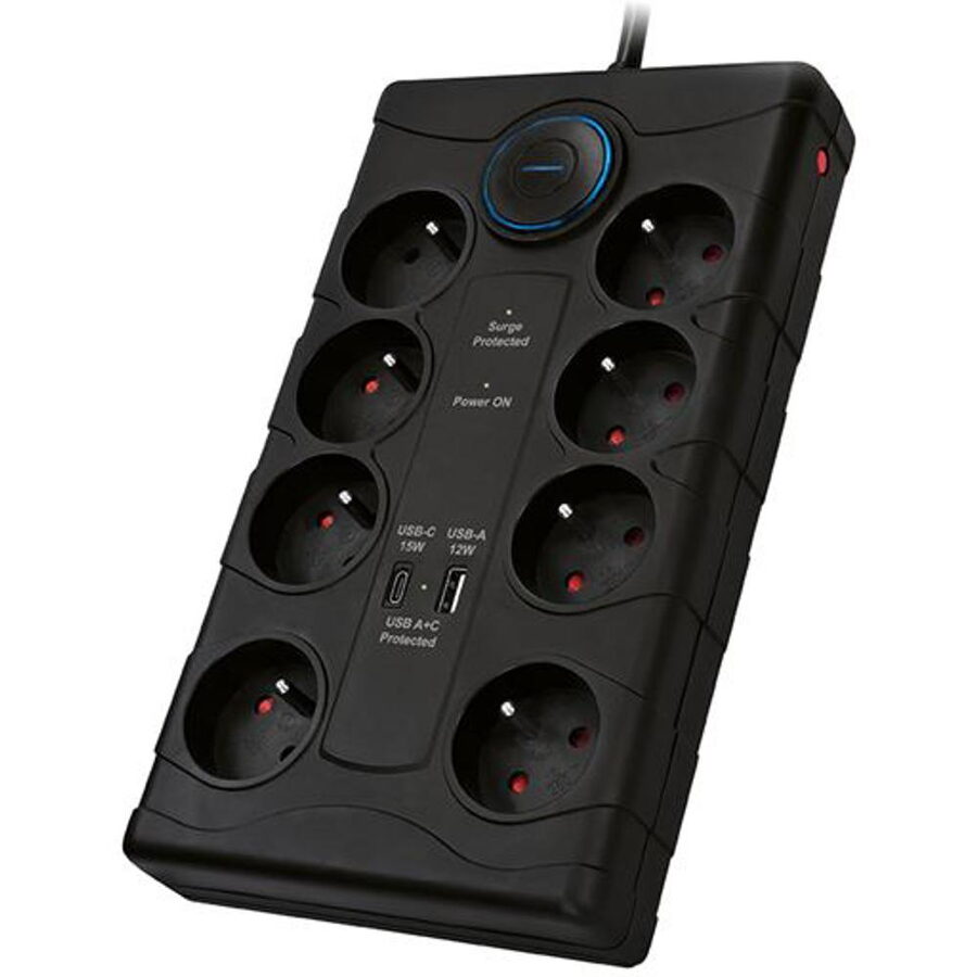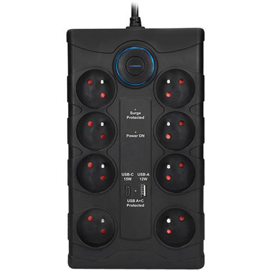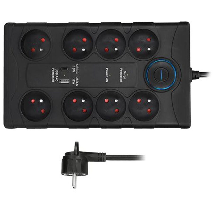 LED indikace Přepěťová ochrana aktivní, Zásuvky 230V chráněny, USB A + C porty chráněny