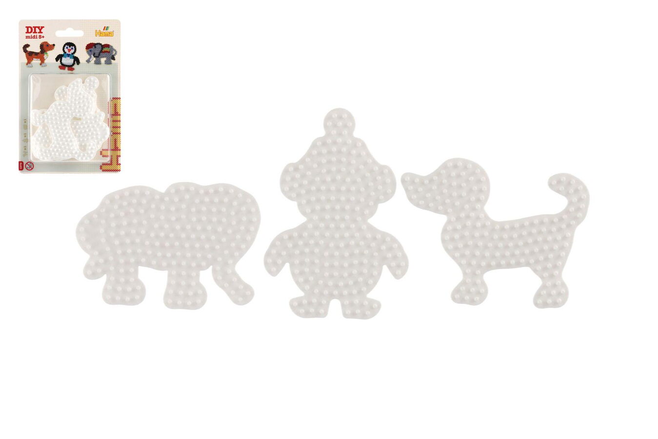 Pomůcka pro vytváření obrázků ze zažehlovacích korálků. Sada bílých plastových podložek obsahuje slona, tučňáka a pejska. Vhodné od 5 let.