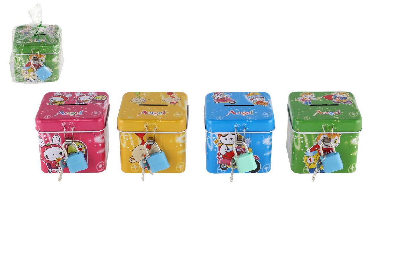 Pokladnička se zámkem plechová kostka 7x6cm 4 barvy v sáčku