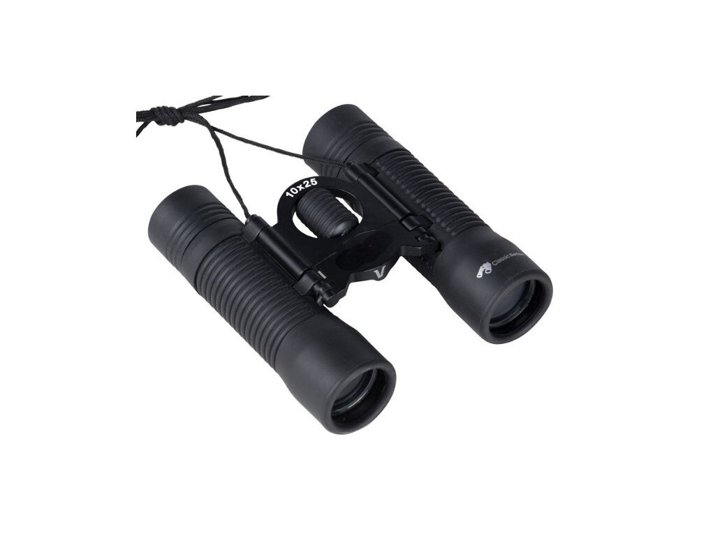 Kompaktní pozorovací dalekohled Polaroid 10 x 25. Optika potažená antireflexní vrstvou, vestavěná dioptrická korekce okuláru pro uživatele s brýlemi. Součástí brašna a čisticí utěrka na optiku.