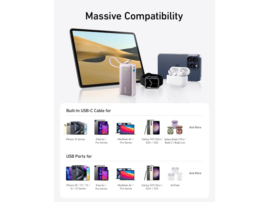 Součástí konstrukce je integrovaný kabel USB-C, který je vždy po ruce a nahrazuje potřebu nosit samostatný kabel. Další port (USB-C nebo USB-A) umožňuje současné napájení dvou zařízení najednou.