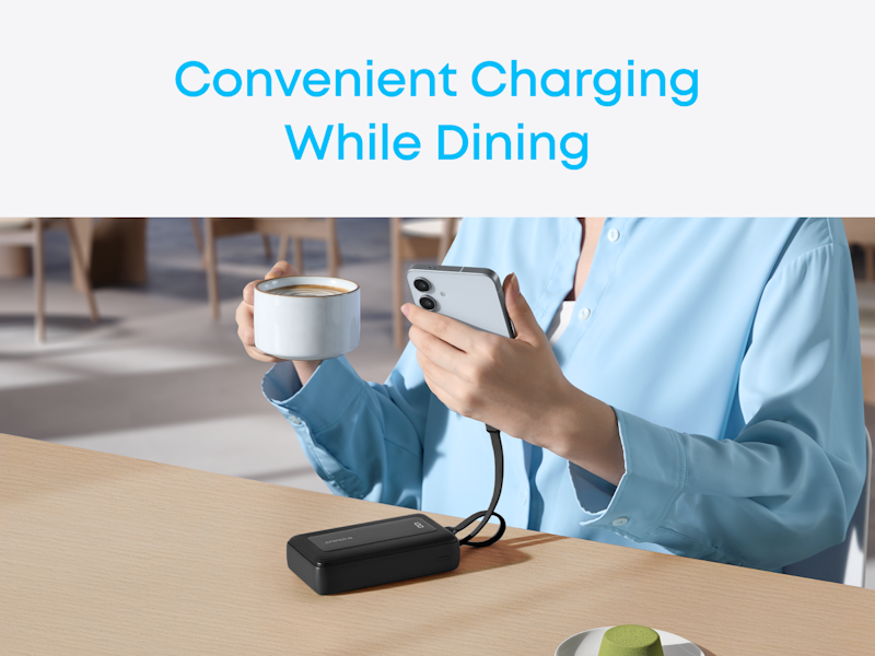 Vestavěné kabely: Dva odolné USB-C kabely zajišťují dlouhou životnost a pohodlné nabíjení bez nutnosti nosit vlastní kabely.