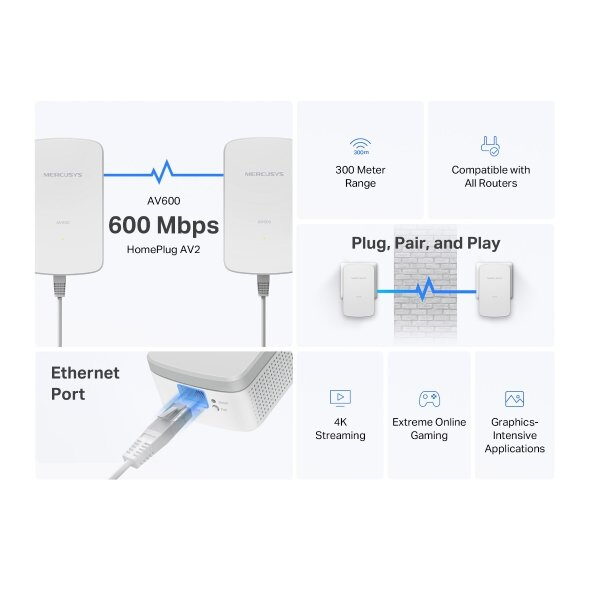 MP300 KIT přenáší internetové připojení rychlostí až 600 Mbps prostřednictvím stávajících elektrických rozvodů. Spolehlivý přenos bez rušení Wi-Fi signálu a s dosahem až 300 metrů umožní bezproblémové streamování videa ve 4K, hraní her i online práci.