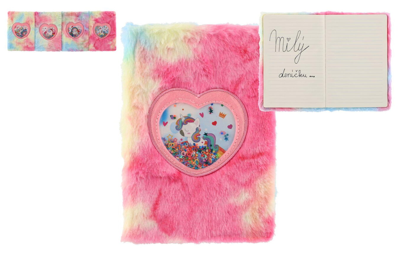 Krásný a cool zápisník v duhovém plyšovém obalu, který dělá tento blok jedinečným. Na jeho přední straně je i okénko s flitry a jednorožcem. Perfektní na poznámky, deníček nebo kresby.