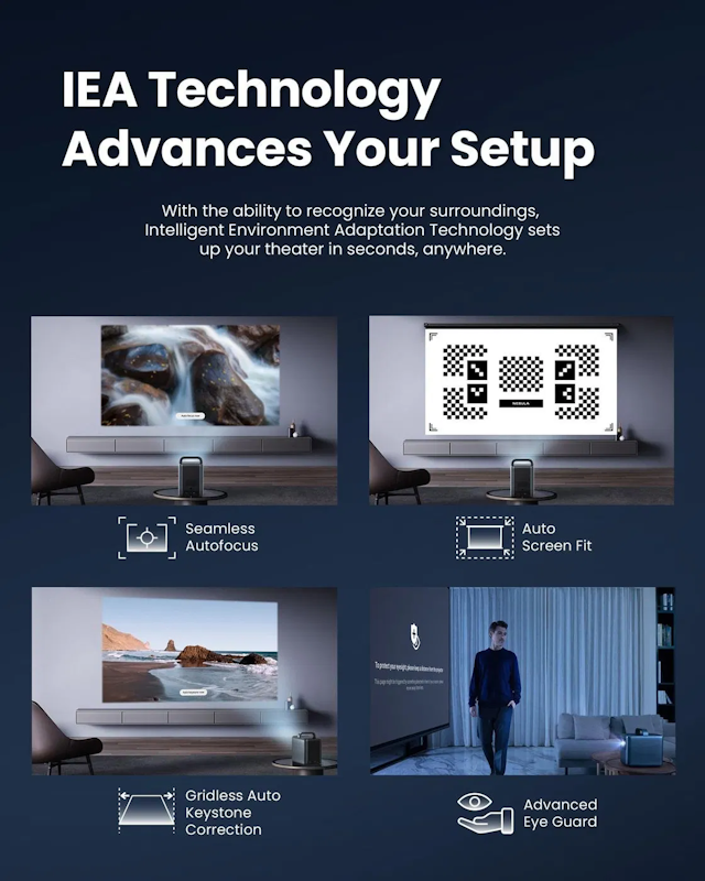 Inteligentní konfigurace IEA 4.0: Cosmos 4K SE se inteligentně přizpůsobí vašemu prostoru díky automatickému zaostřování v reálném čase, lichoběžníkové korekci, automatickému vyhýbání se překážkám, přizpůsobení se obrazovce, barvě stěn, okolnímu osvětlení a dalším funkcím.
