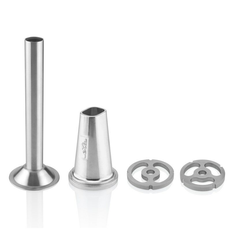 Při mletí masa si můžete zvolit hrubé nebo velmi hrubé mletí, a to za pomocí dvou nerezových destiček. K výrobě uzenin využijete nerezový nástavec o průměru 20 mm. Samozřejmostí je i ochranný kryt pro zajištění bezpečnosti. Nerezové díly můžete mýt v myčce nádobí.