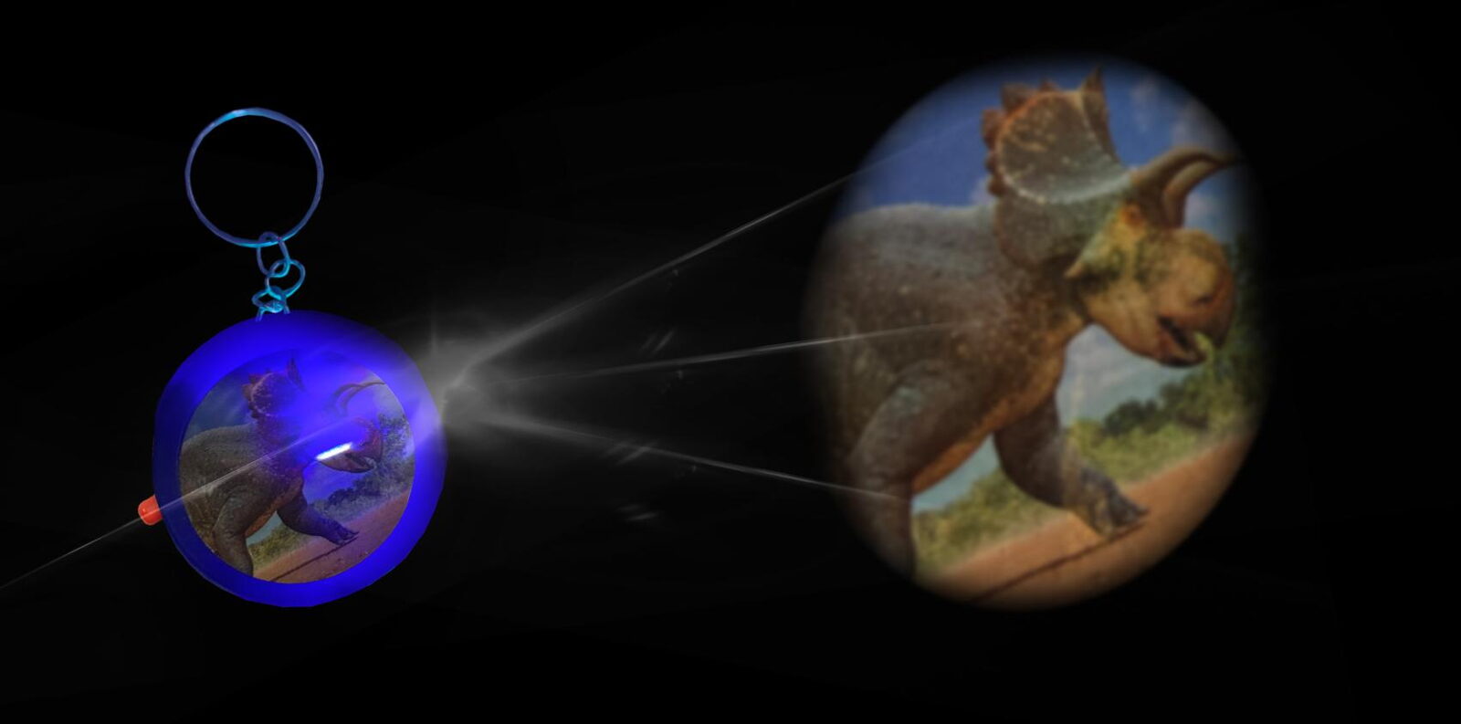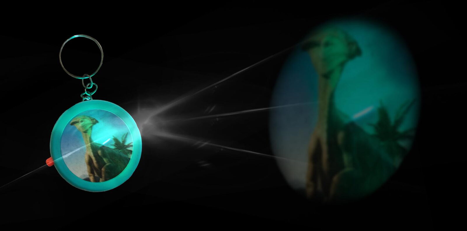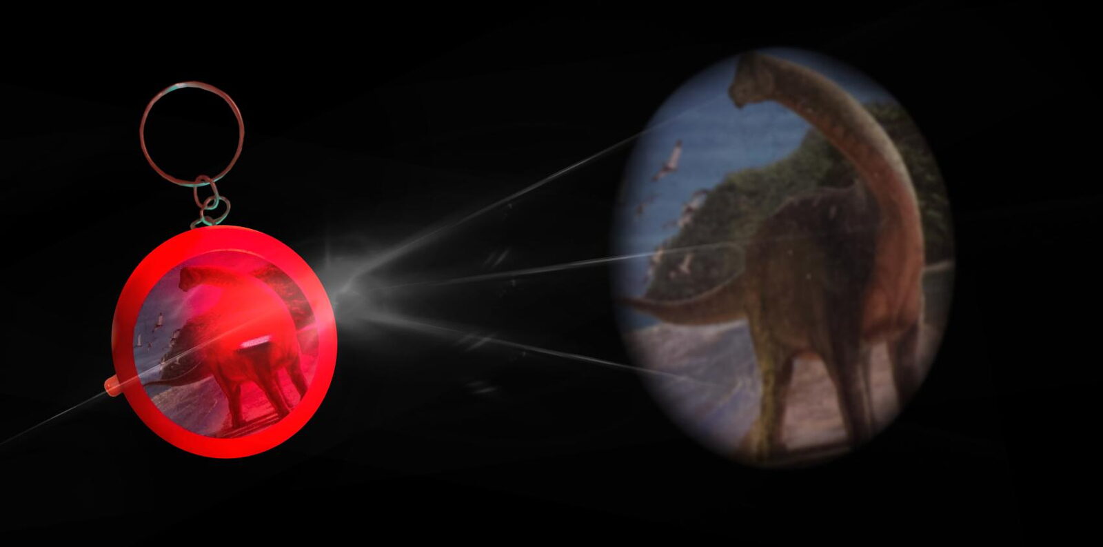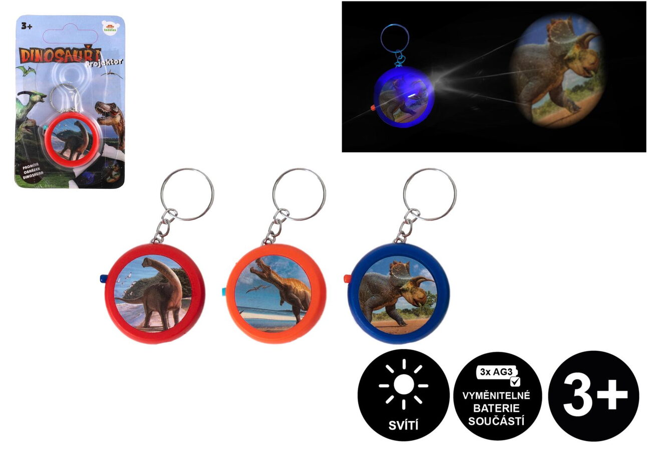 Projektor, který každý milovník dinosaurů a světýlek může nosit vždy po ruce, jako klíčenku. Zmáčkněte tlačítko na boku a celý se rozvítí, na zeď Vám bude promítat obrázek jednoho dinosaura.