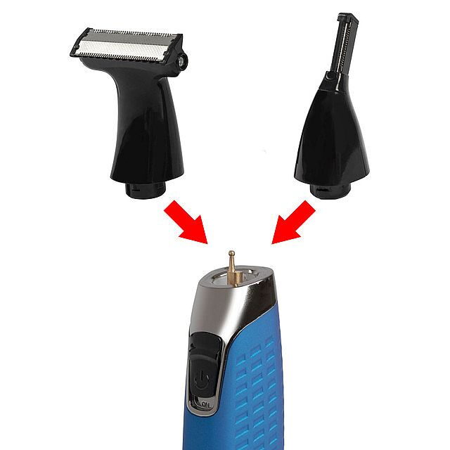 - Multifunkční nástavec s vertikálně namontovanou střihací hlavou z nerezové oceli pro odstranění chloupků z nosu, uší a zastřižení obočí