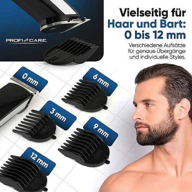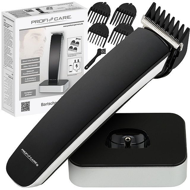 Profesionální zastřihovač vlasů a vousů od značky ProfiCare v pouzdře s vysokým leskem. Provozovat lze jak z akumulátoru, tak ze sítě a disponuje funkcí přímého provozu - i s plně vybitou baterií můžete zastřihovač připojit do sítě a ihned ho začít používat bez nutnosti nabití akumulátoru. Součástí balení je cestovní adaptér pro provoz od 100 V do 240 V. Pro rovnoměrný střih je zastřihovač vybaven vysoce kvalitní ocelovou hlavou. Stříhat lze v několika délkách (0, 3, 6, 9 a 12 mm). V balení jsou dále 4 odnímatelné hřebenové nástavce. Zastřihovač se skvěle drží v ruce a usnadní tak manipulaci s ním. Pro snadné čištění je možné odejmout střihací hlavu. LED kontrolky ukazují stav nabití baterie a lze tak snadno poznat, v jakém stavu nabité se baterie nachází. Zastřihovač se nabíjí na základně, která vy vybavena pogumovanými nožičkami, aby mohla zaručit stabilní držení. Napájení je 100-240 V, 50/60 Hz; NiMh akumulátor 2x 600 mAh.