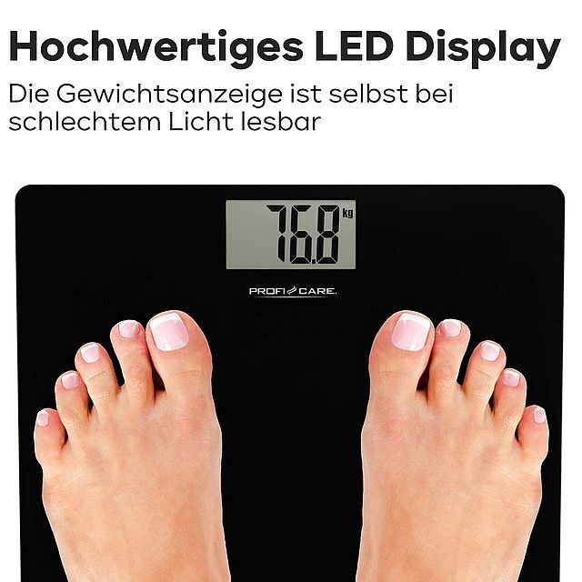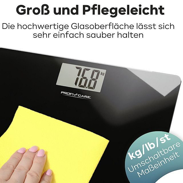 Elektronická osobní váha ProfiCare PW 3122 je vybavena snadno čitelným a vysoce kvalitním LCD displejem, který umožňuje pohodlné sledování váhy v kilogramech, librách nebo stonech, díky konvertibilním jednotkám. S rozsahem měření od 5 do 180 kg s přesností v krocích po 100 g poskytuje přesné výsledky. Díky nástupní automatice je vážení jednoduché a rychlé. Kromě toho má extra velkou skleněnou plochu o rozměrech přibližně 30 x 30 cm, která je nejen hygienická, ale také odolná proti poškrábání a snadno udržovatelná. Automatické vypnutí prodlužuje životnost baterie, zatímco bezpečný stojan s protiskluzovými nožičkami zajišťuje stabilitu během používání. Indikátor slabé baterie vám připomene, kdy je čas na výměnu baterií. Provozovat tuto váhu lze pomocí 2x 1,5 V AAA baterií (které nejsou součástí balení), což umožňuje její použití kdekoli bez nutnosti připojení k elektrické síti.