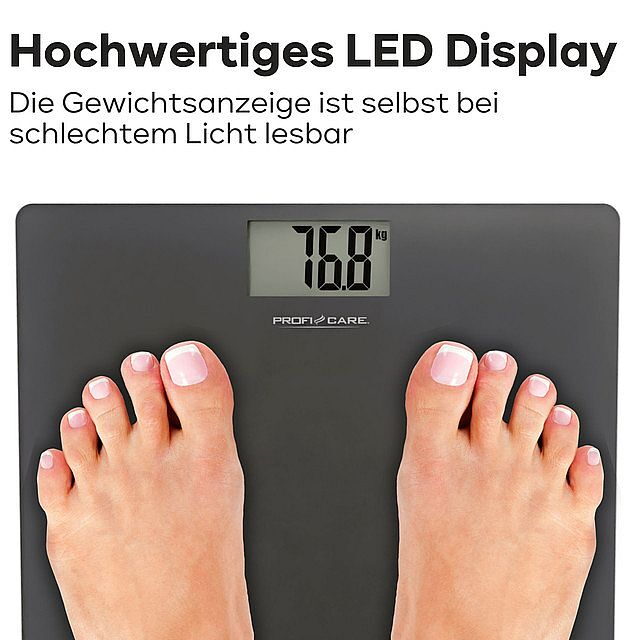 Elektronická osobní váha ProfiCare PW 3122 je vybavena snadno čitelným a vysoce kvalitním LCD displejem, který umožňuje pohodlné sledování váhy v kilogramech, librách nebo stonech, díky konvertibilním jednotkám. S rozsahem měření od 5 do 180 kg s přesností v krocích po 100 g poskytuje přesné výsledky. Díky nástupní automatice je vážení jednoduché a rychlé. Kromě toho má extra velkou skleněnou plochu o rozměrech přibližně 30 x 30 cm, která je nejen hygienická, ale také odolná proti poškrábání a snadno udržovatelná. Automatické vypnutí prodlužuje životnost baterie, zatímco bezpečný stojan s protiskluzovými nožičkami zajišťuje stabilitu během používání. Indikátor slabé baterie vám připomene, kdy je čas na výměnu baterií. Provozovat tuto váhu lze pomocí 2x 1,5 V AAA baterií (které nejsou součástí balení), což umožňuje její použití kdekoli bez nutnosti připojení k elektrické síti.