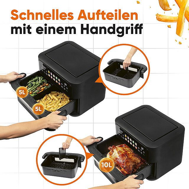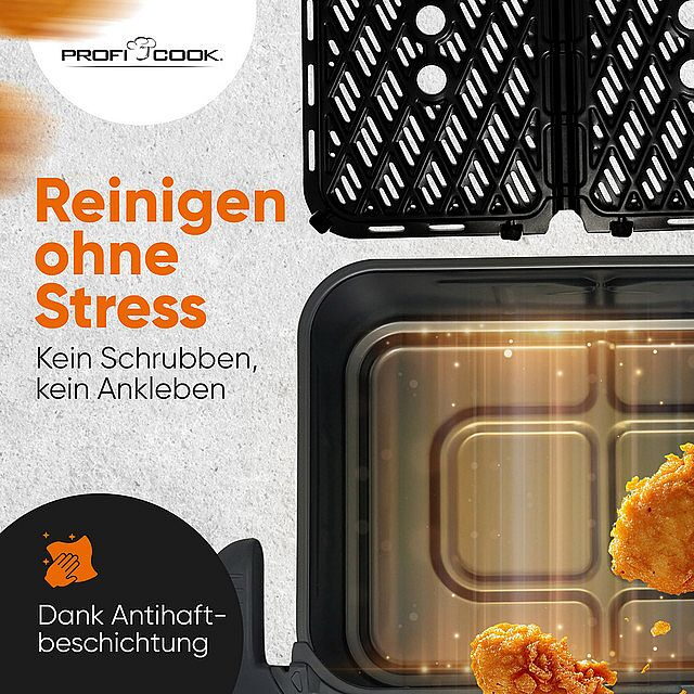 Dvojitá horkovzdušná fritéza PC-FR 1313 H nabízí extra velkou kapacitu 10 litrů a umožňuje zdravou přípravu jídel zcela bez oleje. Díky dvěma nezávislým varným zónám lze současně připravovat dva různé pokrmy bez míchání chutí. Fritéza je vybavena oddělitelnou nádobou, kterou lze rozdělit na dvě samostatné nádoby o objemu 2 × 5 litrů. Velká grilovací plocha 34 × 25 cm a možnost samostatného i kombinovaného provozu zajišťují maximální flexibilitu při vaření. Ovládání probíhá pomocí dvou senzorových dotykových panelů a vícebarevného grafického displeje. K dispozici je 10 automatických programů i možnost individuálního nastavení času a teploty v rozsahu 80–200 °C.