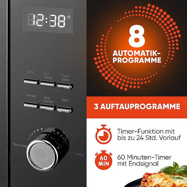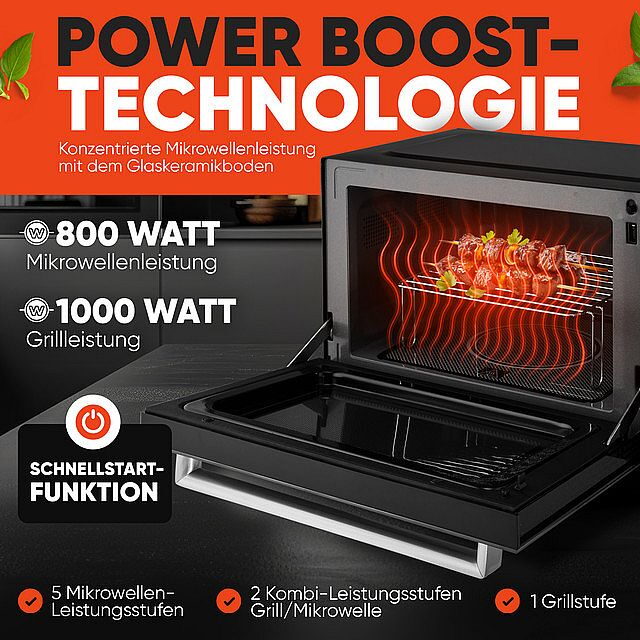 Objevte ProfiCook® mikrovlnnou troubu s grilem PC-MWG 1204 - perfektní řešení pro snadné a rychlé vaření ve vaší kuchyni! Díky velkorysému varnému prostoru o objemu 23 litrů nabízí tato mikrovlnná trouba dostatek prostoru pro všechna vaše kulinářská dobrodružství. Ploché dno varné komory umožňuje maximální flexibilitu a bez problémů pojme i čtvercové talíře. Tajemstvím této všestrannosti je sklokeramická základna, která nabízí o 55 % více využitelného prostoru ve srovnání s tradičními mikrovlnami. Vertikálně otevíraná zrcadlová dvířka dodají vaší kuchyni nádech elegance a dotváří je kvalitní nerezová rukojeť. Díky designu Easy Clean je čištění hračkou, protože podlaha je snadno přístupná. Se speciální technologií Power Boost se mikrovlny soustředí na vysoce kvalitní sklokeramickou základnu a zajišťují rychlý a rovnoměrný ohřev. Mikrovlnná trouba ProfiCook® nabízí 800 wattů mikrovlnného výkonu a působivých 1 000 wattů výkonu grilu. Díky zrcadlovému skleněnému přednímu dílu a funkci rychlého startu je ovládání hračkou. Vyberte si z 5 úrovní mikrovlnného výkonu, 1 úrovně grilování nebo použijte 2 kombinované úrovně výkonu pro optimální výsledky. Naše mikrovlnná trouba má 8 automatických programů a 3 programy rozmrazování, které vám usnadní přípravu vašich oblíbených pokrmů. Přiložený grilovací rošt o rozměrech 24 x 24 cm rozšíří vaše kulinářské možnosti.