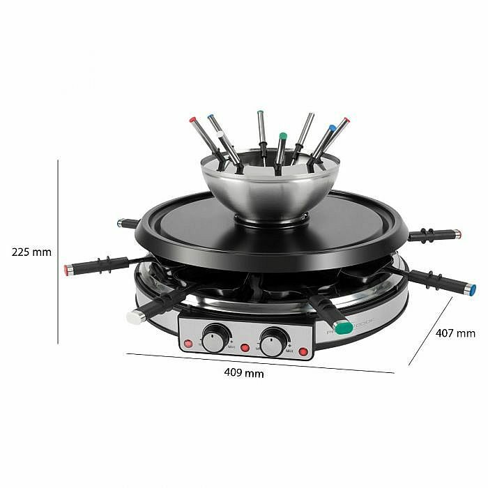 Podle chuti a nálady lze nádobu na fondue uprostřed vyměnit za přírodní kámen dodávaný se sadou, takže hotová jídla mohou být udržována v teple nebo maso/ryby a zelenina mohou být šetrně vařené. Vhodné také pro udržování teplých omáček, dipů, polévek atd. Pohodlné a flexibilní použití díky extra dlouhému kabelu (cca 2 m), 2 plynule nastavitelným termostatům a 2 samostatným topným okruhům: raclette a fondue lze přepínat nezávisle