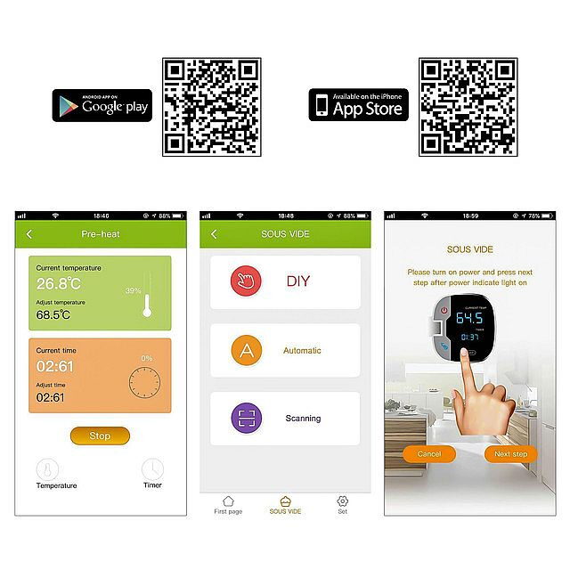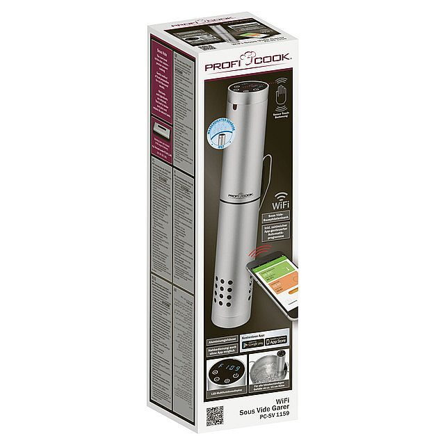 Sous Vide vařič pro přesné a zdravé vaření je vybaven Wi-Fi funkcí, díky které lze propojit s mobilní aplikací. Přes mobilní aplikaci se odemknou další funkce zařízení, jako například řízené automatické programy pro přesné vaření různých jídel. Díky Sous-Vide vaření zůstávají zachovány vitamíny, živiny a chutě jídla. Prostřednictvím zvoleného programu se teplota a čas nastaví automaticky. Teplota lze také nastavit manuálně a po celou dobu vaření je odchylka v teplotě nejvýše +/- 0,5 °C. Sous Vide vařič lze také použít pro výrobu jogurtu nebo pro rozmrazování, pro což jsou vyhrazeny funkce. Zvládne cirkulovat až 8 litrů vody za minutu. Teplota lze nastavit v rozmezí 40-90 °C po 0,5°C krocích. Zařízení se ovládá pomocí dotykového panelu s LED displejem, který zobrazuje potřebné informace jako aktuální teplota, zvolená teplota a časovač. Časovač lze nastavit až na dobu 99 hodin. Vařič je vyroben z nerezové oceli a pouzdra odolného proti vodě dle certifikace IPX7. Je vhodný pro všechny nádoby s výškou minimálně 15 cm. Při nízkém stavu hladiny vody se vařič automaticky vypne. Je velice jednoduchý na čištění. Napájení je 220-240 V, 50/60 Hz a výkon 1 000 W.