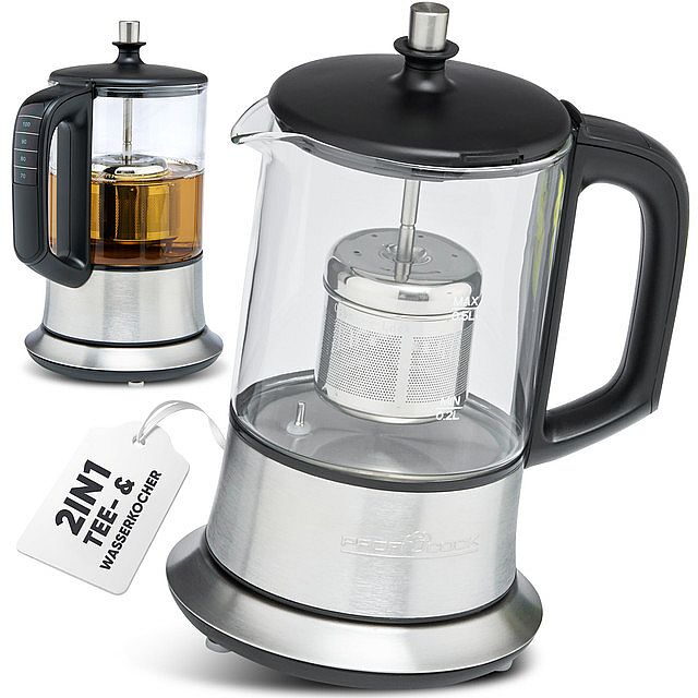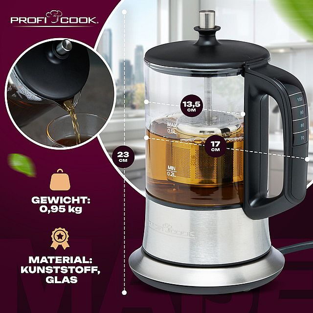 2 v 1 - čajovar a rychlovarná konvice od značky ProfiCook umožňuje elektronické nastavení teploty od 70 °C do 100 °C vždy po 10°C krocích. Na rukojeti se zobrazuje aktuální teplota a lze na ní také nastavit požadovanou teplotu. V čajovaru lze připravit až 0,5 litru čaje. Čajový filtr je vyroben z nerezové oceli a jeho výšku v konvici lze nastavit. Konvice disponuje funkcí automatického vypnutí, ochranou proti vypařování a ochranou proti přehřátí. Výhodou je také funkce udržování teploty. 360° konektor, který slouží pro připojení konvice k její základně umožňuje pohodlné použití jak pro praváky, tak pro leváky. Topný článek je skrytý a vyrobený z nerezové oceli. Konvice je vyrobena z nerezové oceli a bezpečnostního skla s ochranou proti vysokým teplotám. Napájení je 220-240 V, 50 Hz a maximální výkon je 1100 W.